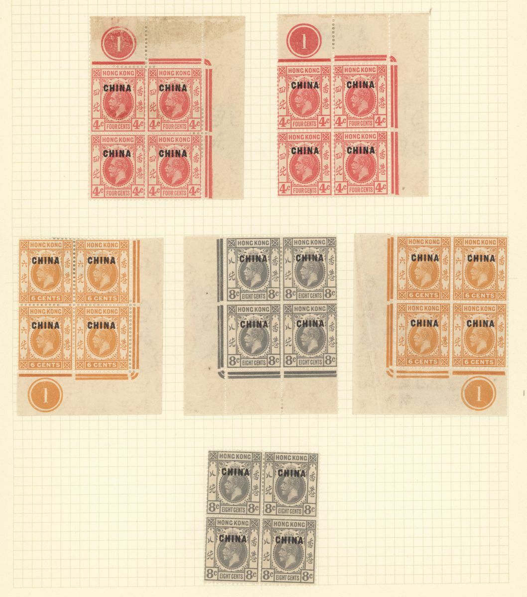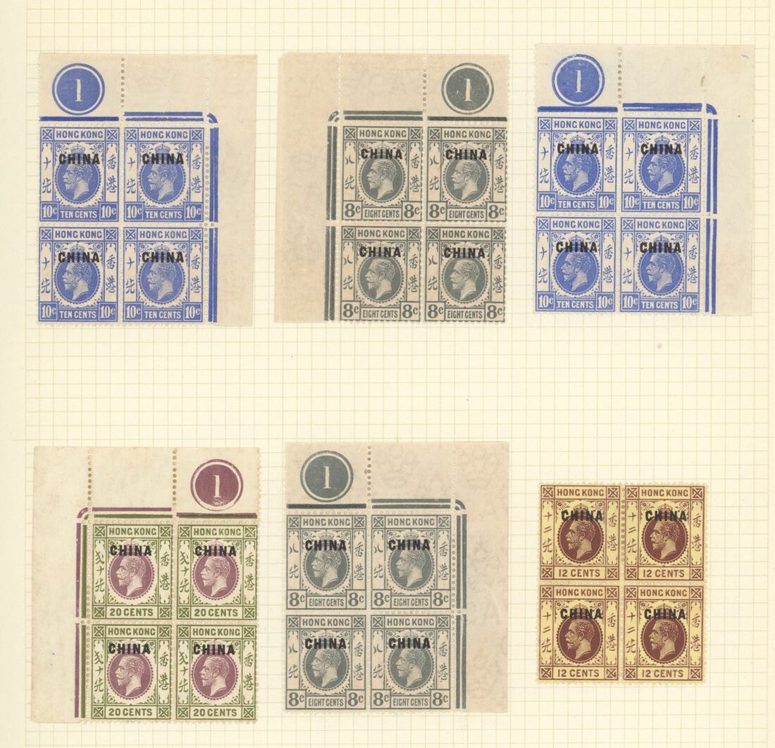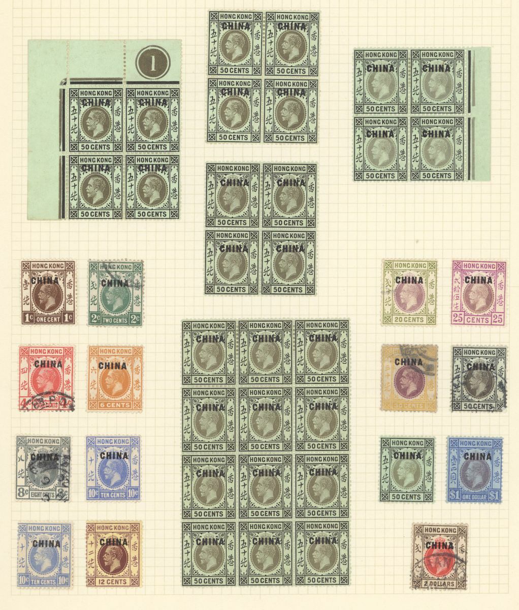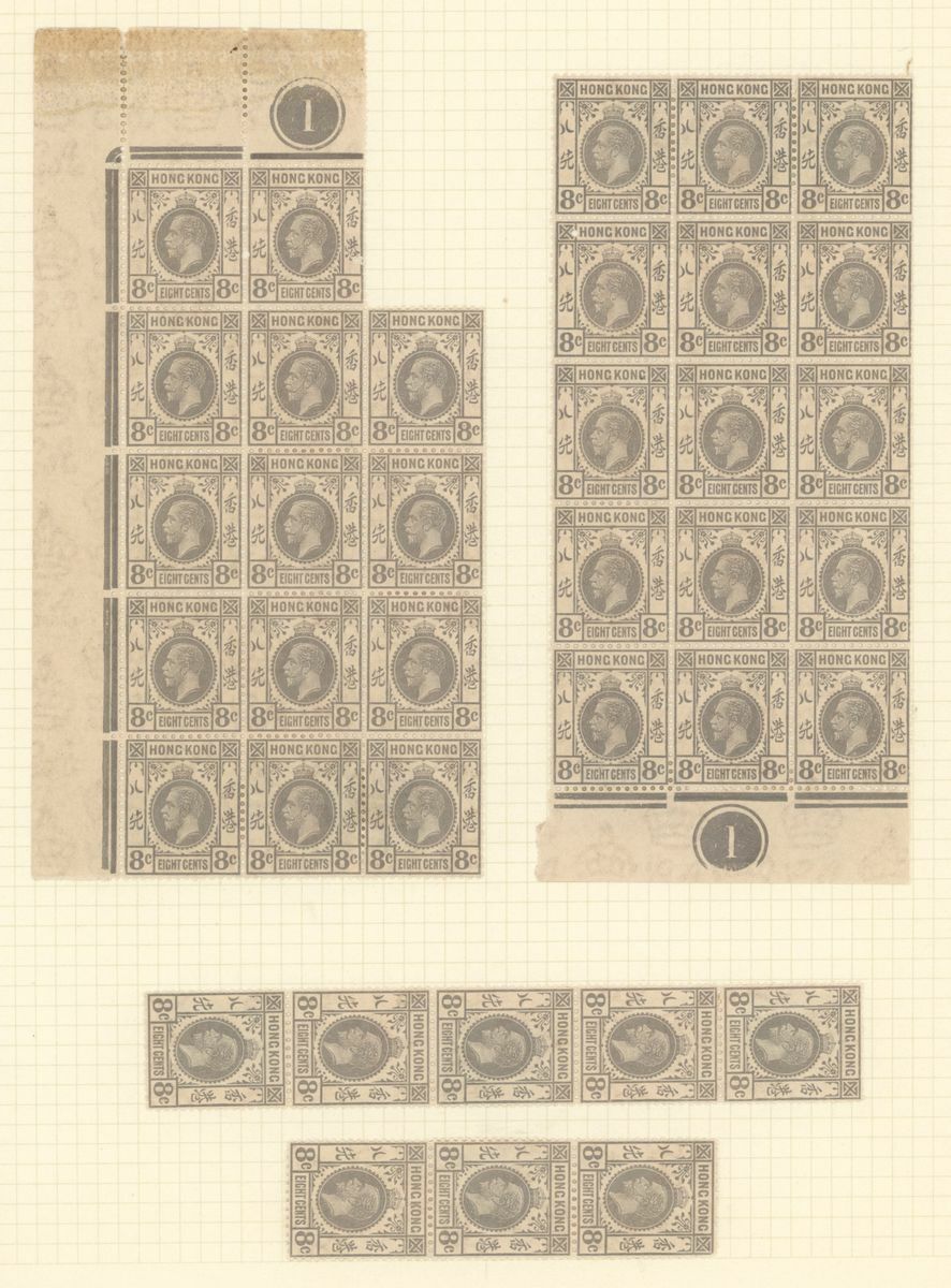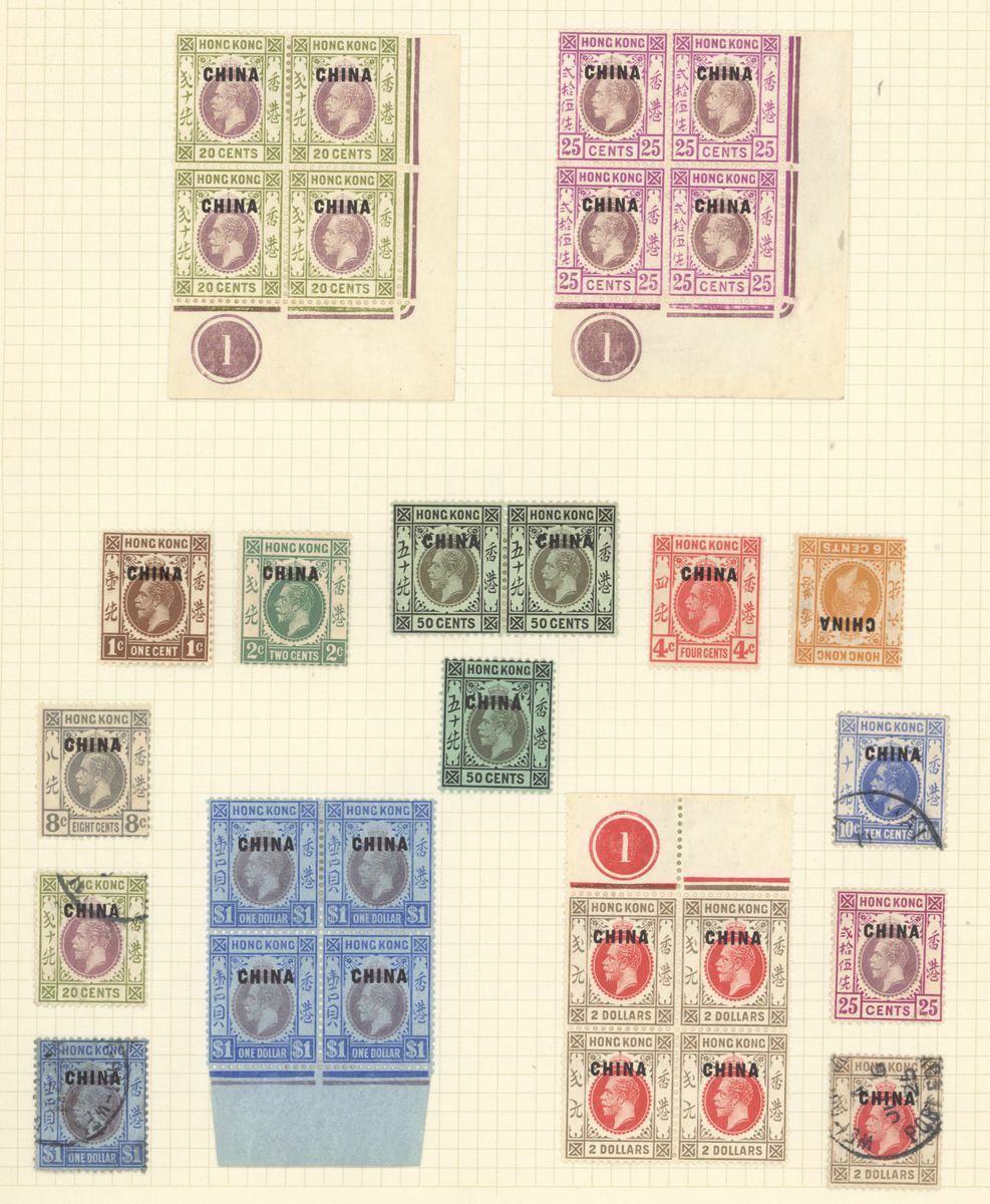 Mostly mint collection on album pages (10) with many blocks (some with sheet numbers) and duplication including 1917-21 selection 1c., 2c., 4c., 6c. 50c. mint blocks of four (3+ of each value) and many with sheet numbers, 8c. and 10c. marginal blocks showing sheet number (2 each), 50c. multiple of twelve, $2 used; 1922-27 set $2 in blocks except 50c. (pair), much duplication with 1c., 2c., 3c. blocks of four (3 each) some with sheet numbers, $1 block and $2 block with upper margin showing sheet number; also Hong Kong 1921-37 8c. (90+) in a range of different multiples, mixed condition and toning present nevertheless a scarce group of multiples.