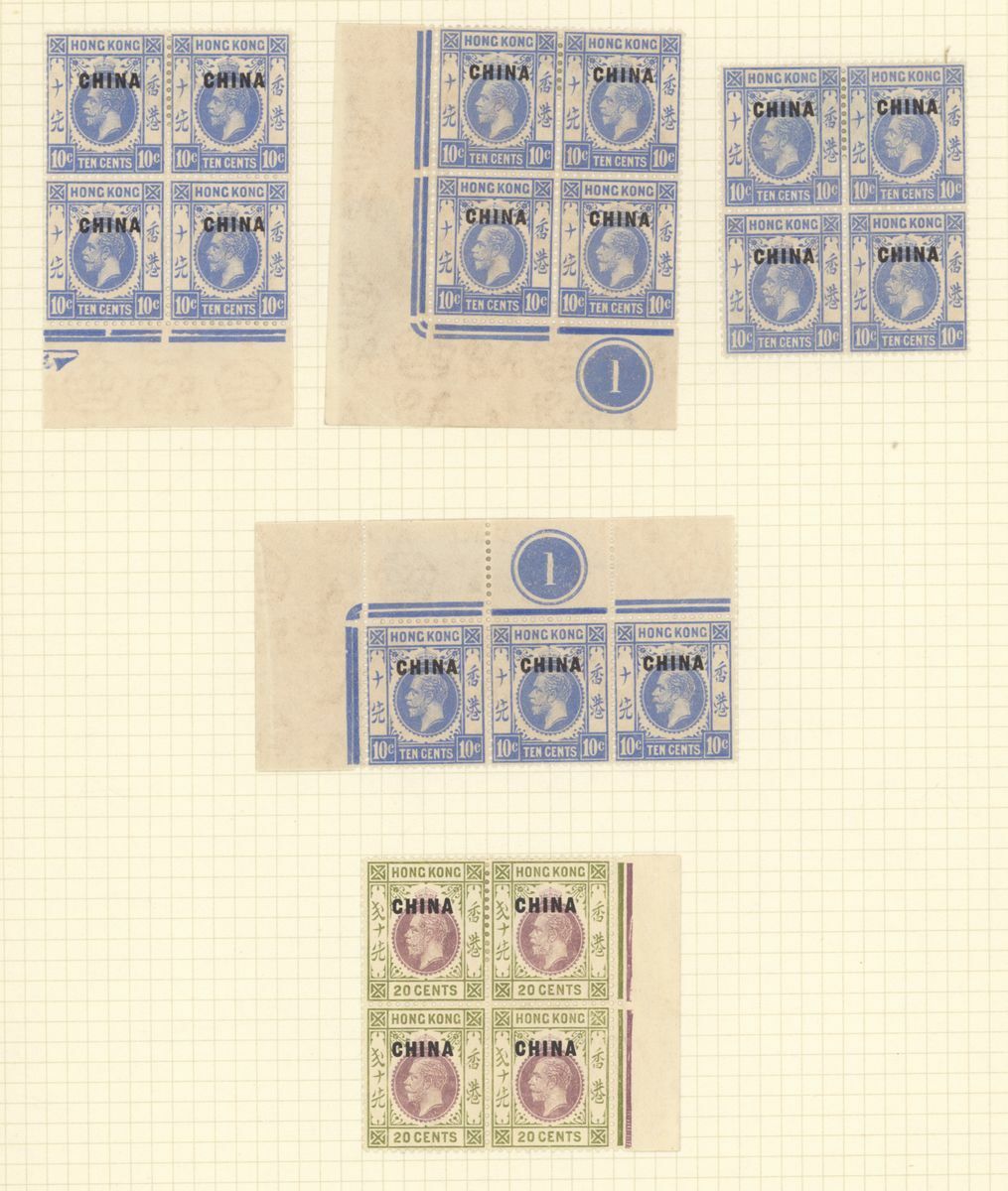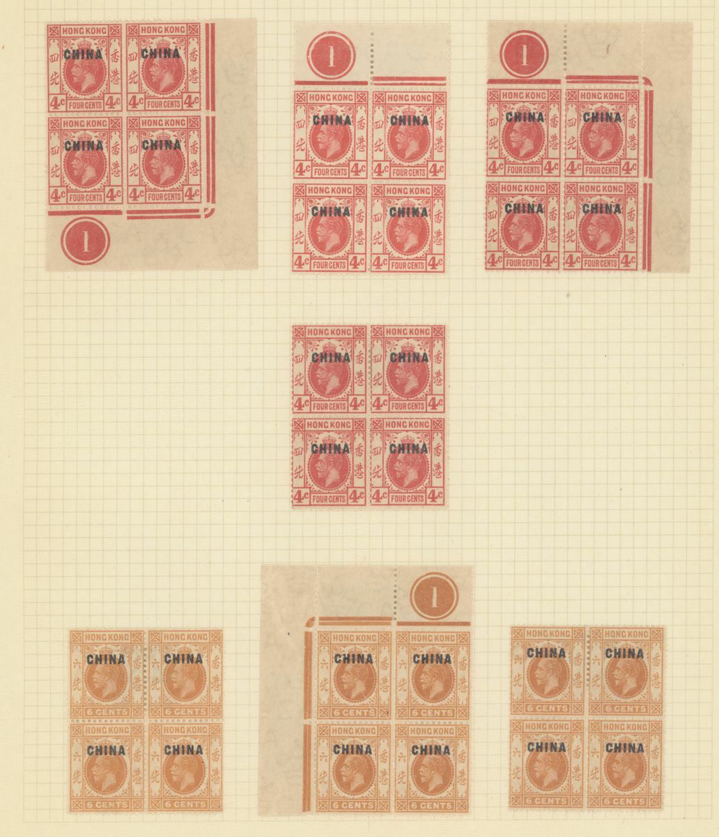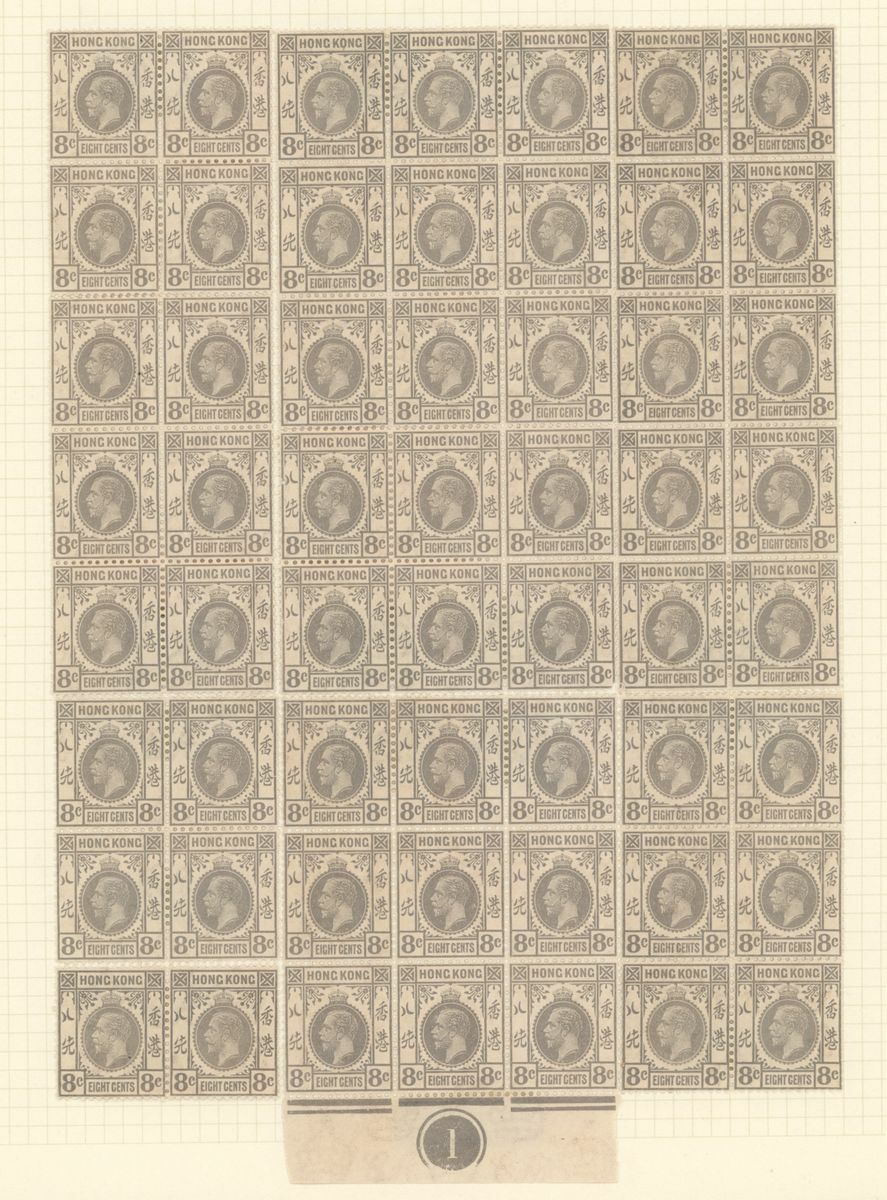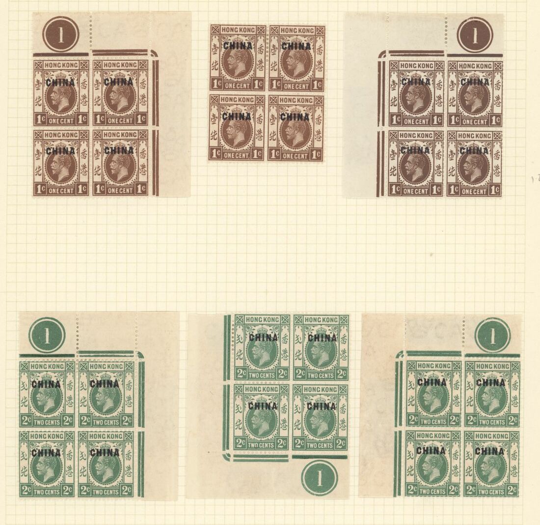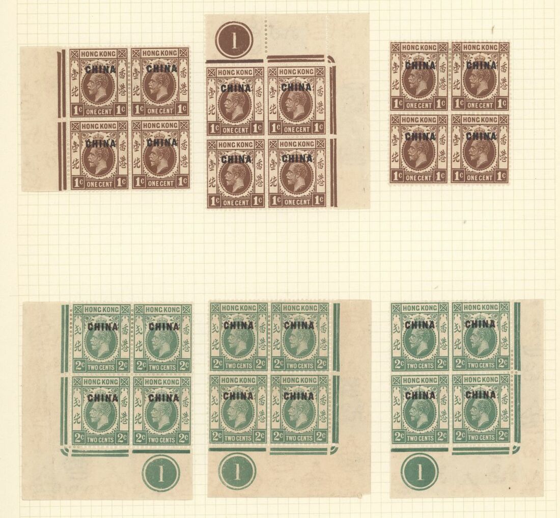 Mostly mint collection on album pages (10) with many blocks (some with sheet numbers) and duplication including 1917-21 selection 1c., 2c., 4c., 6c. 50c. mint blocks of four (3+ of each value) and many with sheet numbers, 8c. and 10c. marginal blocks showing sheet number (2 each), 50c. multiple of twelve, $2 used; 1922-27 set $2 in blocks except 50c. (pair), much duplication with 1c., 2c., 3c. blocks of four (3 each) some with sheet numbers, $1 block and $2 block with upper margin showing sheet number; also Hong Kong 1921-37 8c. (90+) in a range of different multiples, mixed condition and toning present nevertheless a scarce group of multiples.