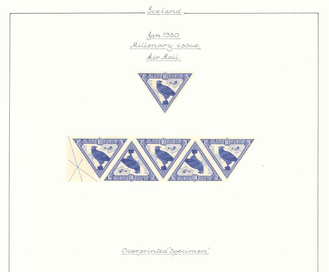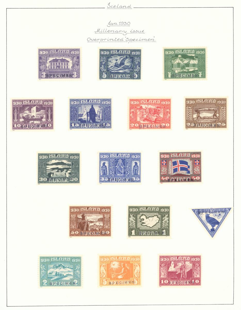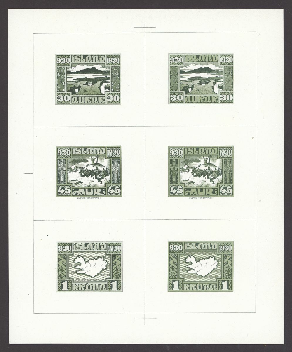 1930 Parliamentary Millenary, collection (73) on pages, including imperf. printers Proof sheet containing the full set of 16 values in grey, 30a., 45a and 1k. imperf. printers sheet of six oversize proofs in green, set overprinted "