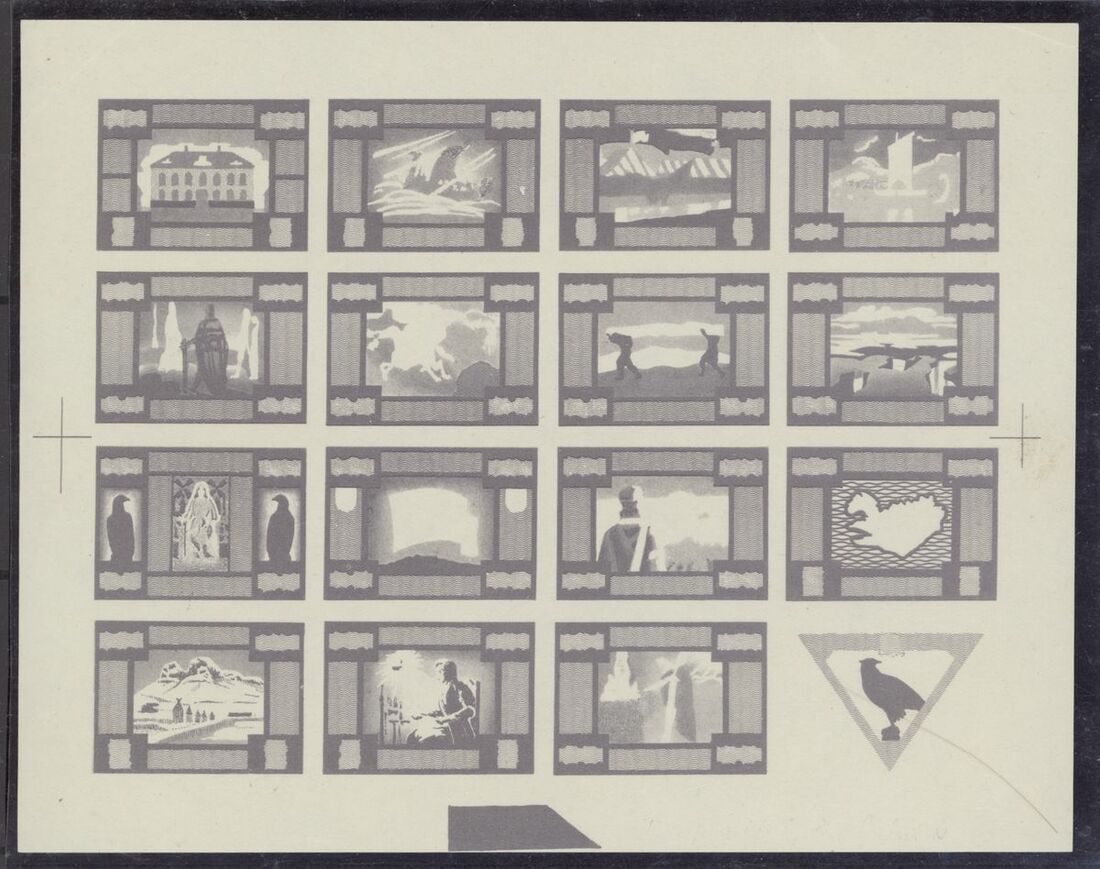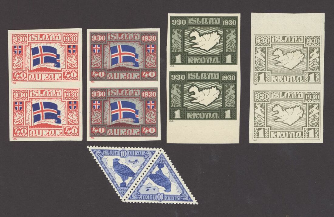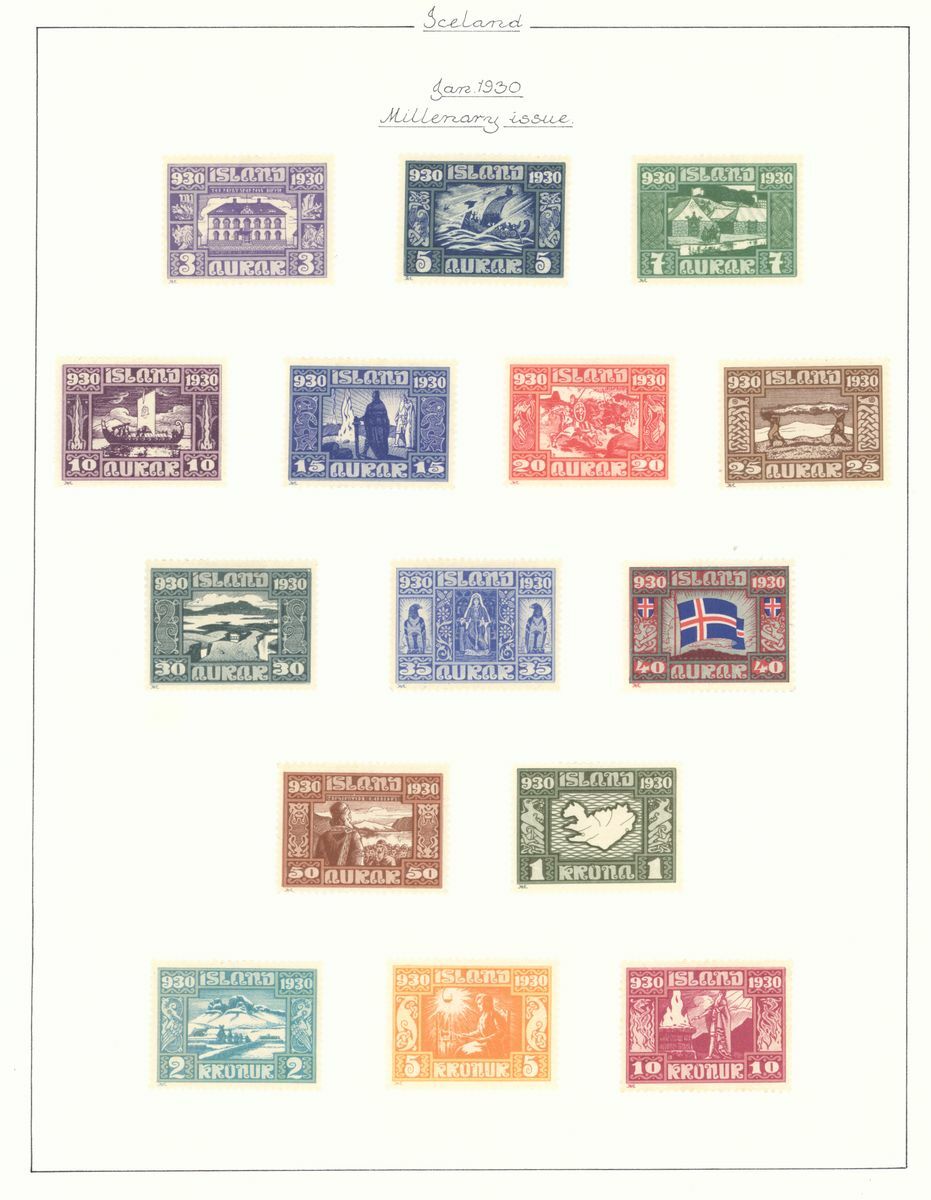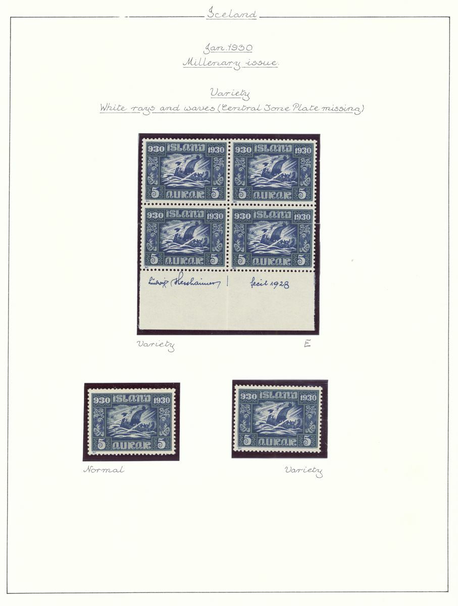 1930 Parliamentary Millenary, collection (73) on pages, including imperf. printers Proof sheet containing the full set of 16 values in grey, 30a., 45a and 1k. imperf. printers sheet of six oversize proofs in green, set overprinted "