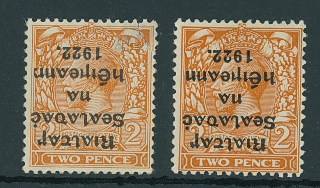 1922 Thom 2d. orange Die I and II, both overprint inverted, large part original gum; fine. S.G. 12a, 13a, £725. Photo