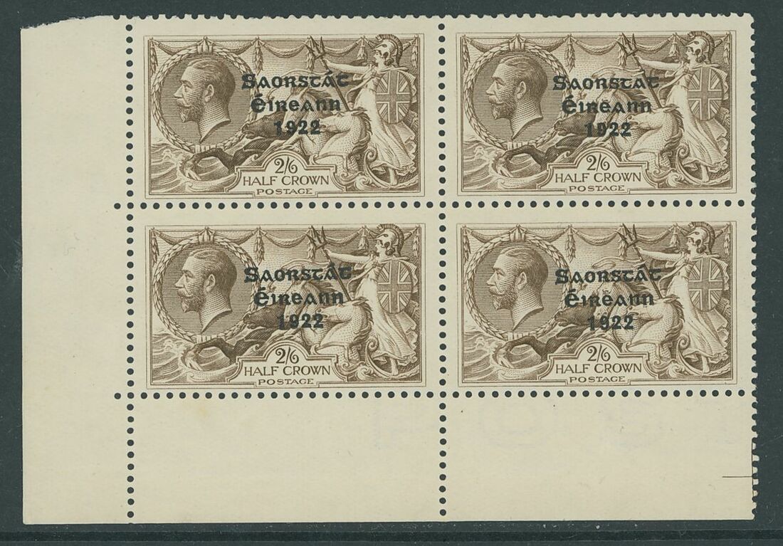 2/6d. chocolate-brown, block of four from the lower left corner of the sheet, the second stamp variety circumflex accent over "a", original gum; the variety and two others unmounted mint, fine. S.G. 86, 86a, £425+. Photo