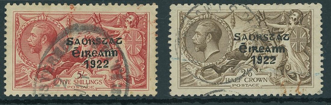 2/6d. chocolate-brown and 5/- rose-carmine, each "flat accent on "a" variety", used; a few red marks, good to fine. S.G. 86c, 87c, £1,550