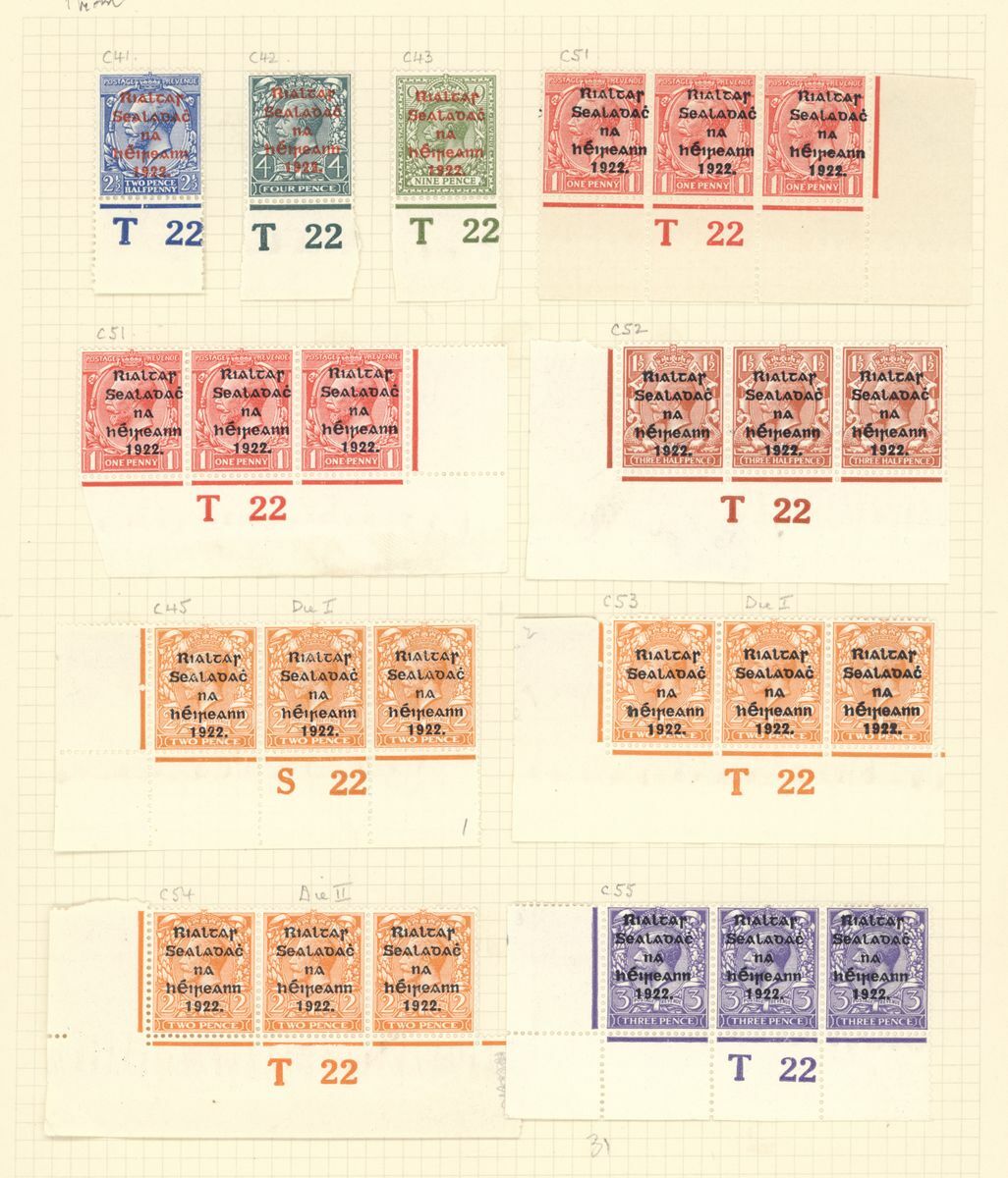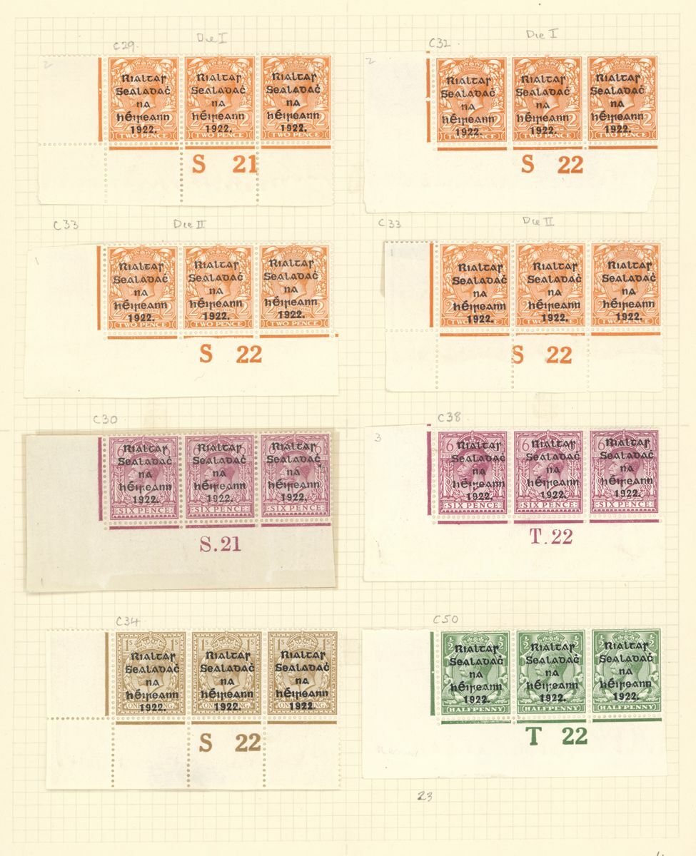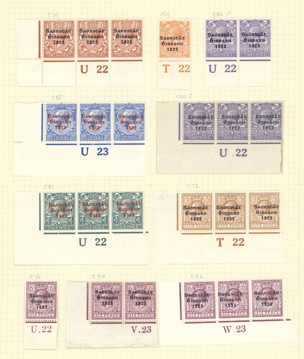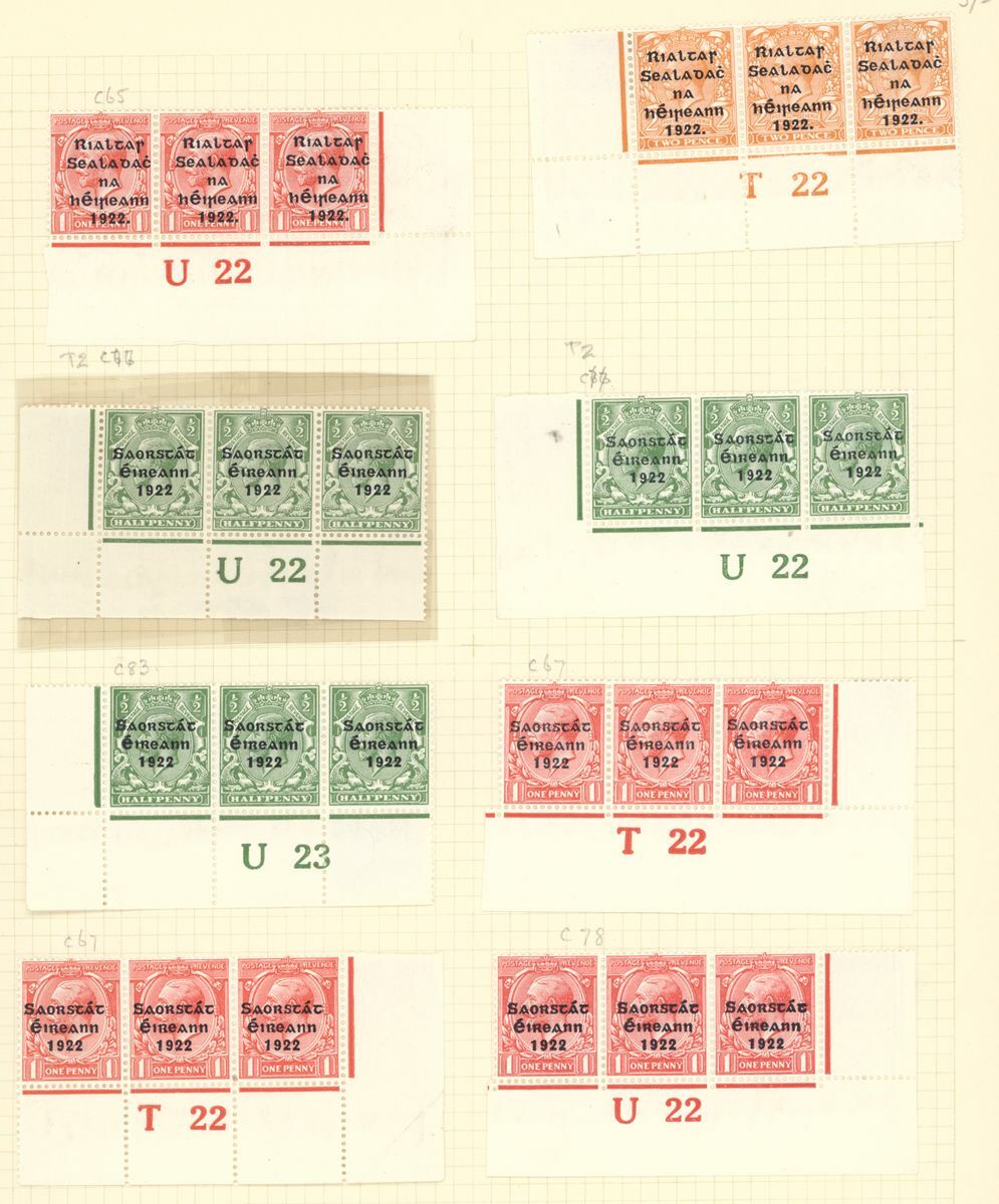 Collection of seventy three items, mostly strips of three, including Dollard (black) ½d. R21 (imperf.), 9d. S21, 10d. S21, Dollard (red)4d. R21, 9d. S21, Thom (black) 6d. T22, 1/- (S22), Thom (red) 9d. T22, Saorstát 2½d. U23, 10d. T22 (pair), 1/- U22, etc., original gum, chiefly fine