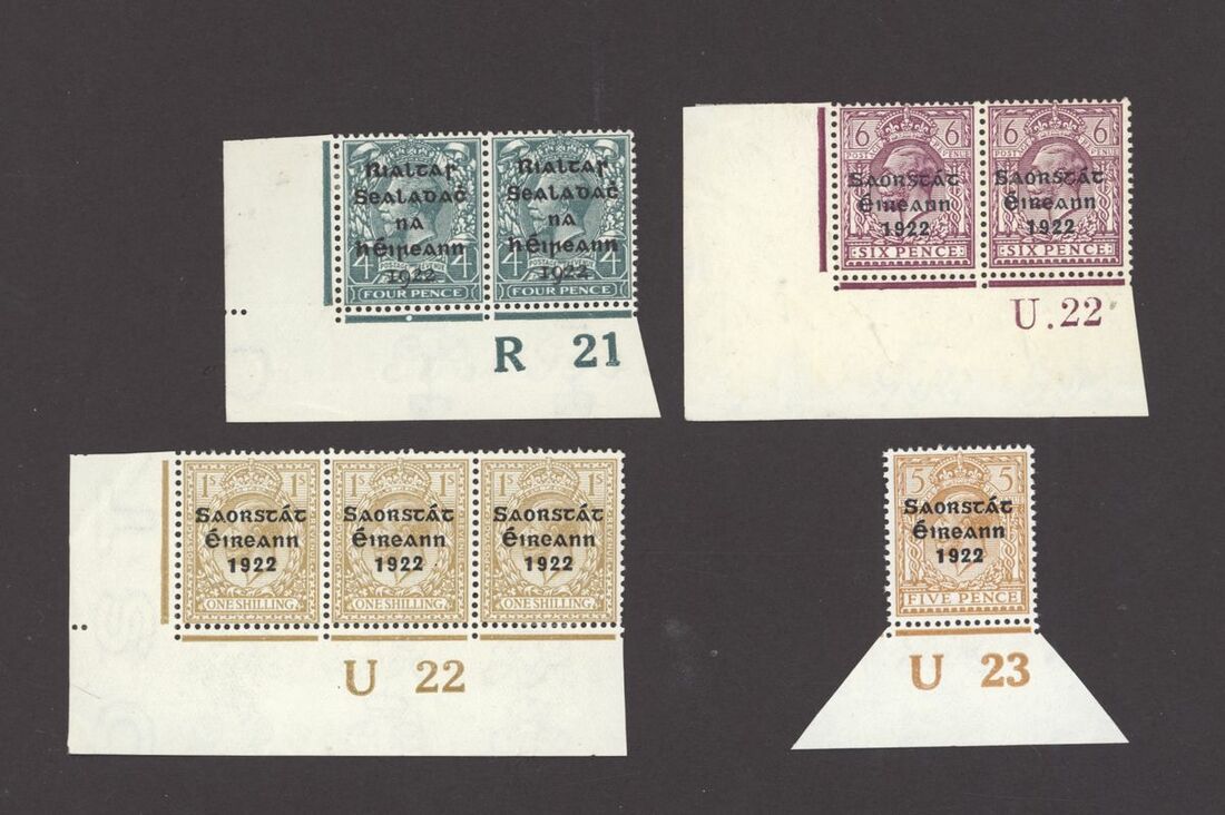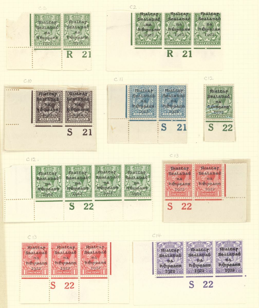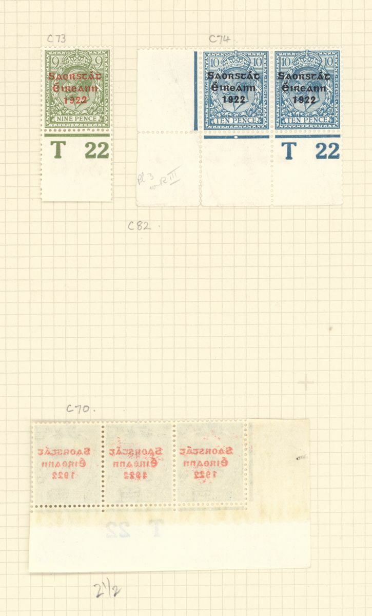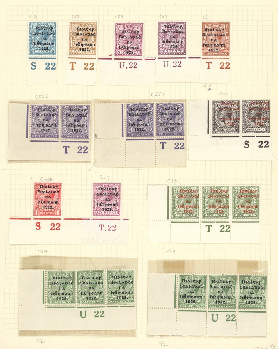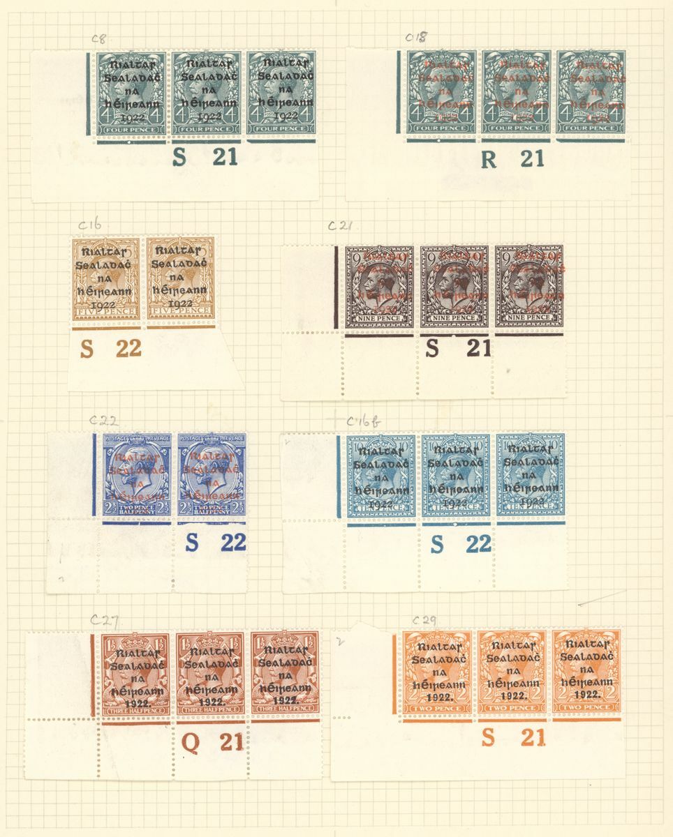 Collection of seventy three items, mostly strips of three, including Dollard (black) ½d. R21 (imperf.), 9d. S21, 10d. S21, Dollard (red)4d. R21, 9d. S21, Thom (black) 6d. T22, 1/- (S22), Thom (red) 9d. T22, Saorstát 2½d. U23, 10d. T22 (pair), 1/- U22, etc., original gum, chiefly fine