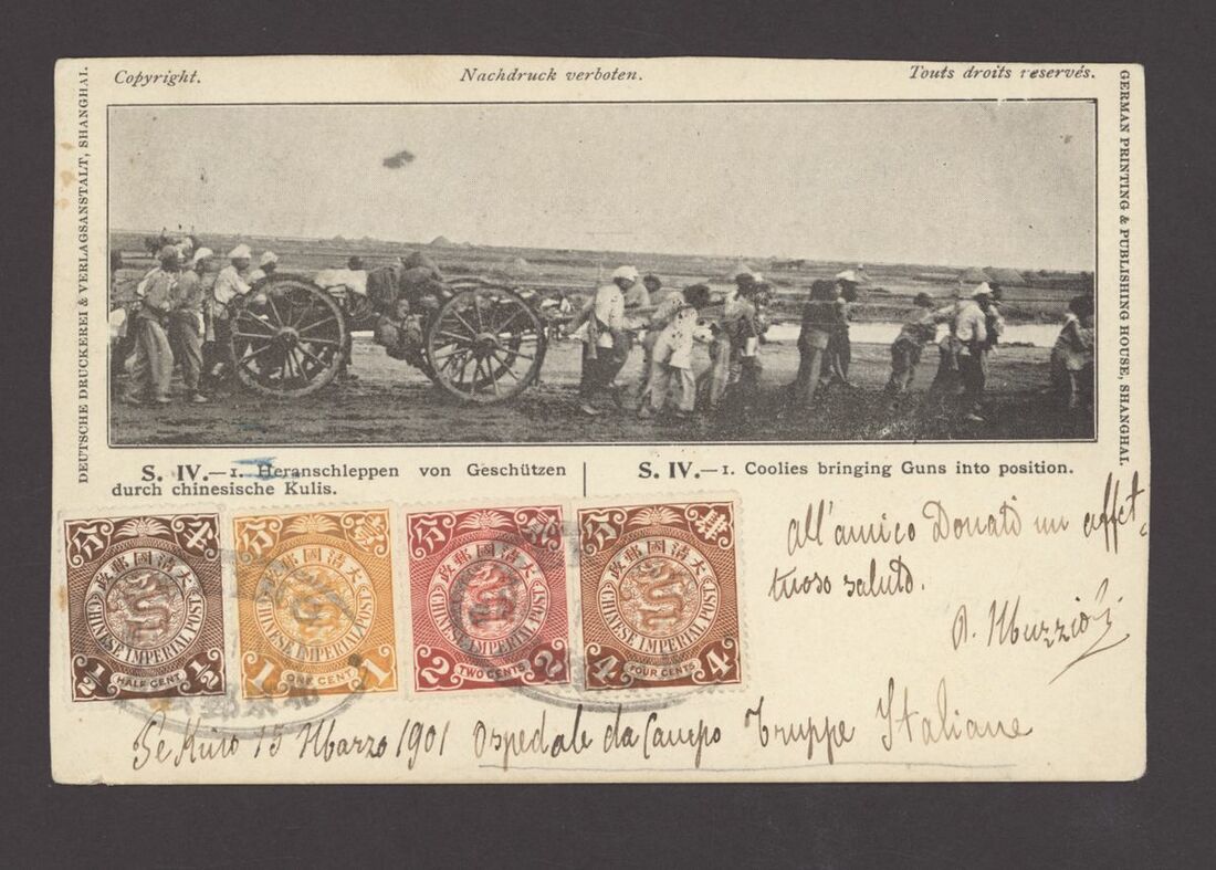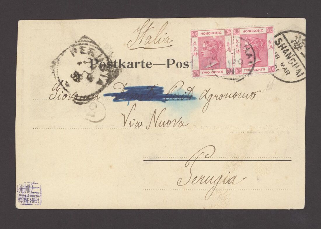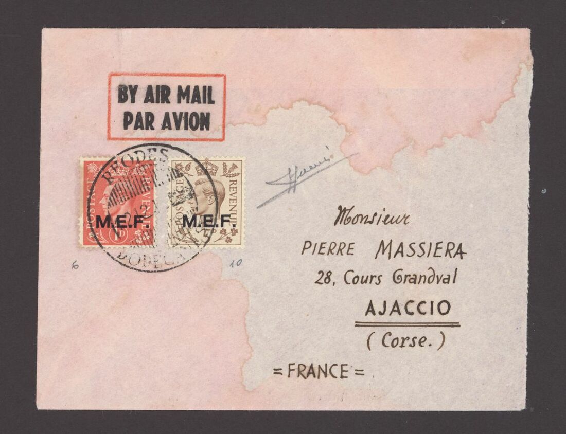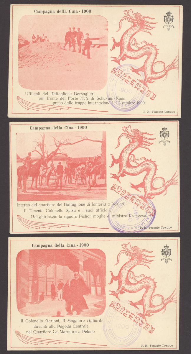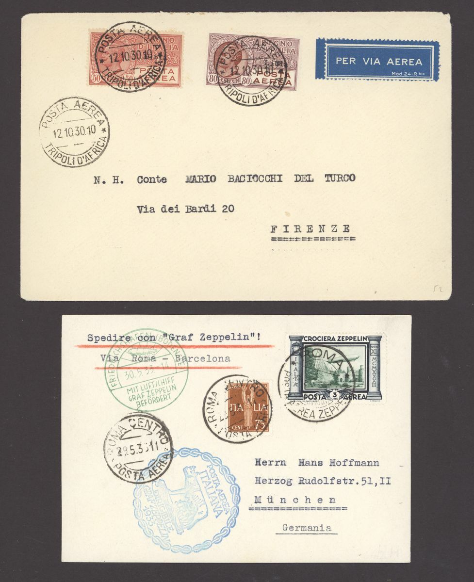Postal history selection (7) including 1901 postcard marked 'Ospedale da Campo truppe Italiane' from Peking to Perugia franked on the picture side with China CIP ½c., 1c., 2c. and 4c. and on the address side with Hong Kong 2c. pair; three different unused postcards 'Campagna della Cina 1900', 1933 Zeppelin card to Munich; 1930 envelope from Tripoli to Florence bearing Italy air mail stamps 50c. and 80c.; also an envelope from Rhodes to Ajaccio bearing M.E.F. 1d. and 5d. with Sorani certificate. Mixed condition.