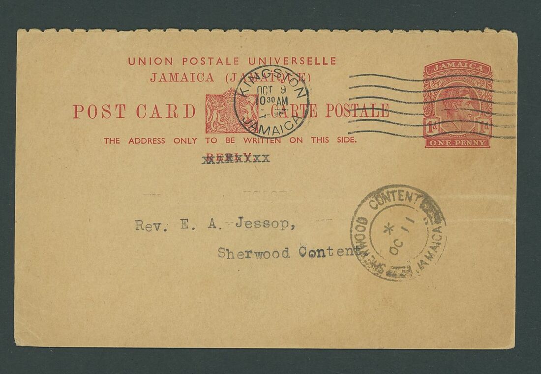 1943 (9 Oct.) 1d. red on buff one half of the 1d. reply-paid card from Kingston addressed to Sherwood Content cancelled by despatch c.d.s. and showing arrival (11.10) c.d.s. Minor expected creasing still of fine appearance, extremely rare, believed to be the only recorded used example from the very small printing despatched on 30.9.38. A wonderful addition for the connoisseur!