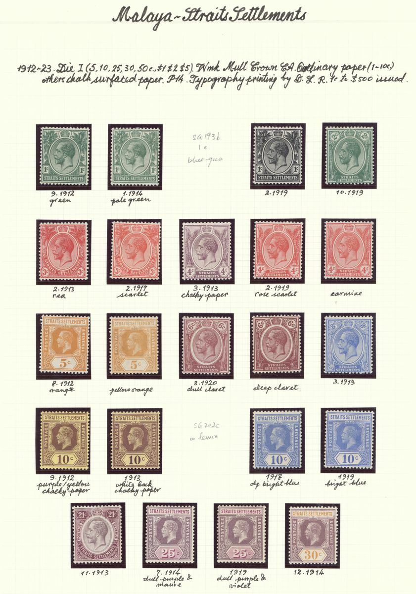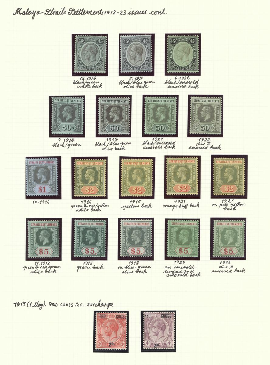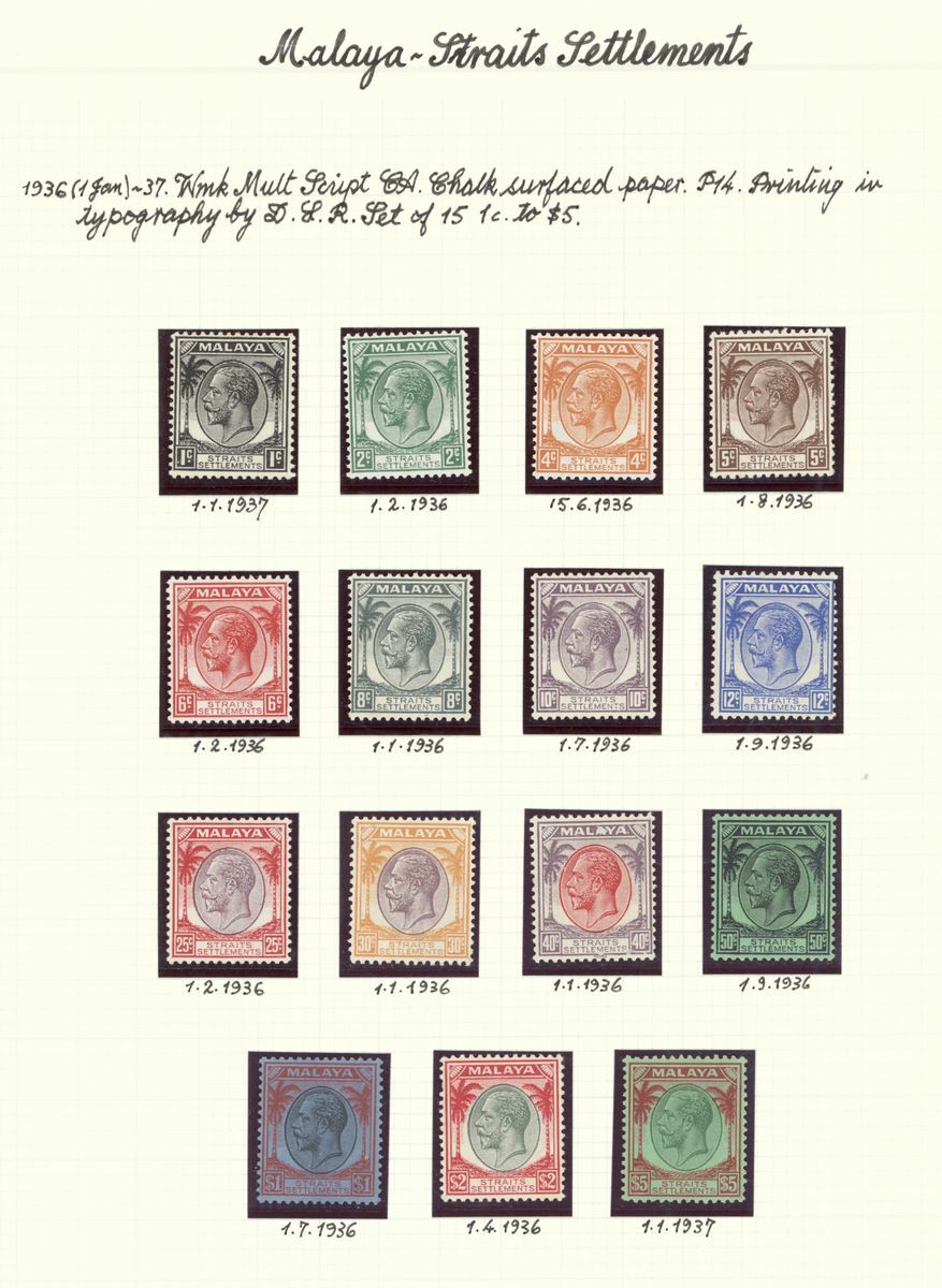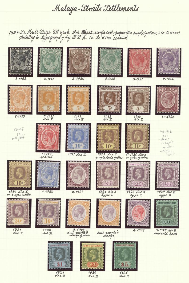 1912-37 mint group on album pages comprising 1912-23 MCA set to $5 including a range of shades including $2 (4) and $5 (5, including blue-green with olive back and with emerald back), 1921-33 Script set to $5 with some additional shades, 1922 Borneo Exhibition set to $5 including some multiples with varieties and 1936 Script set to $5; generally good to fine. S.G. cat value in excess of £2,300