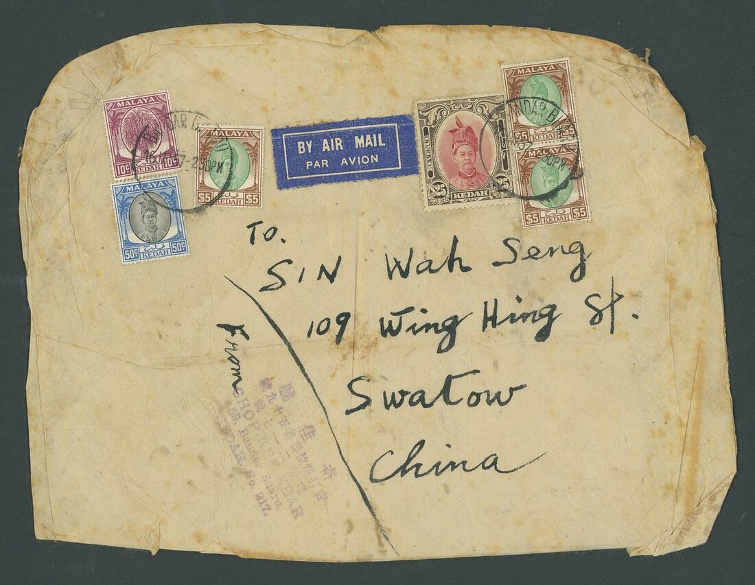 1957 (16 Jan.) air mail packet cover from Bandar Bharu addressed to Swatow, China franked with Sultan Badlishah 1950-55 10c., 50c., $5 (3) and with $25 revenue stamp , some expected faults as usual for this kind of lot, nevertheless a very scarce usage of the $25 revenue for postage.