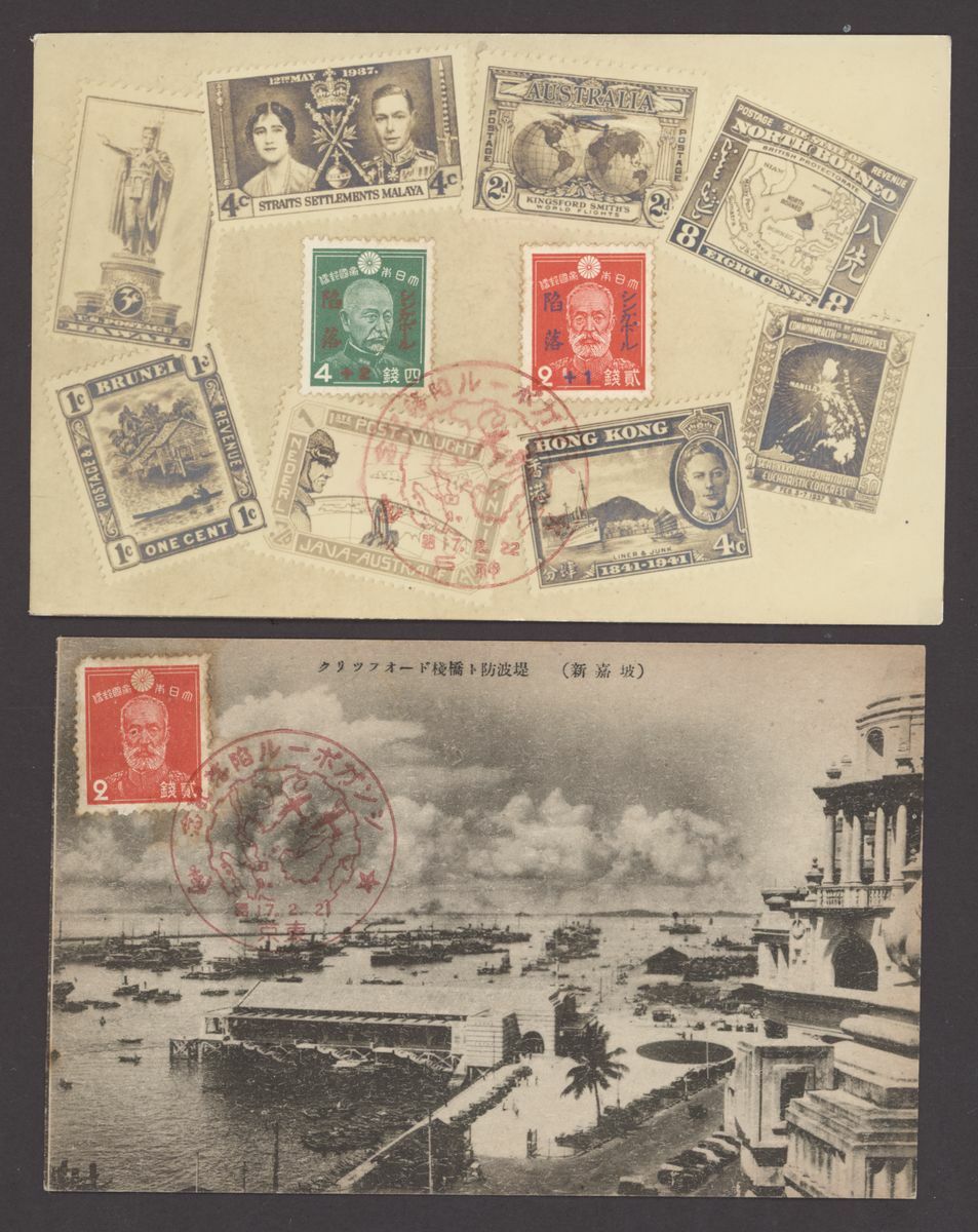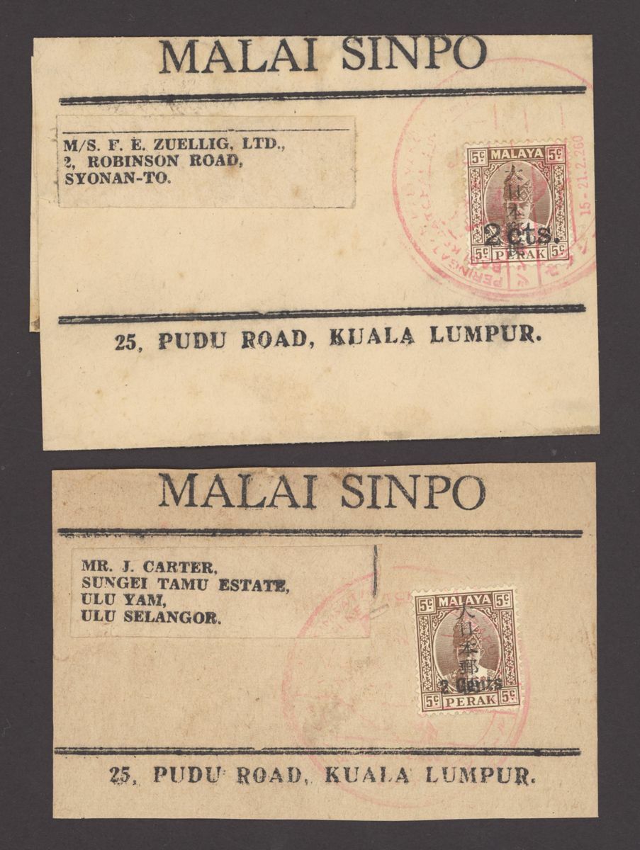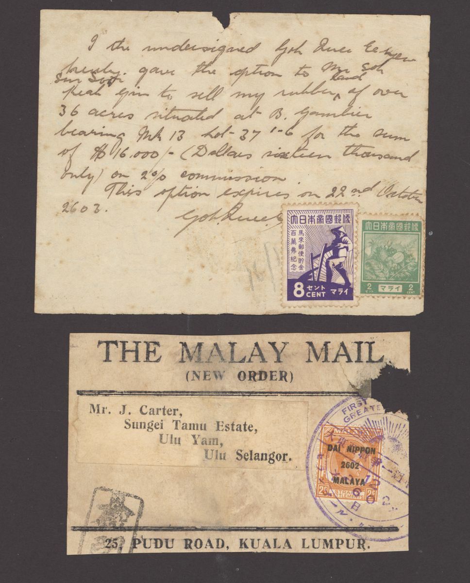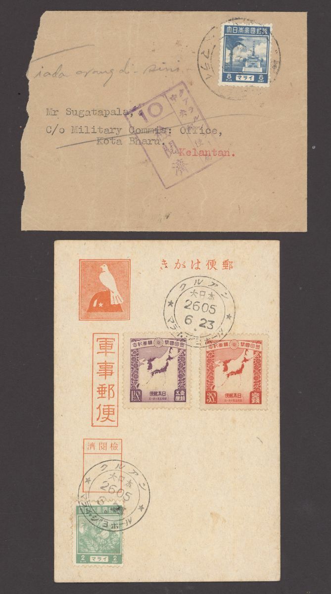 A small balance of consignment including postcards (6 unused, 4 used), a Japanese propaganda leaflet, two newspapers franked with 2c. green, three 'Malai Sinpo' franked labels, plus a few extras. Mixed condition.
