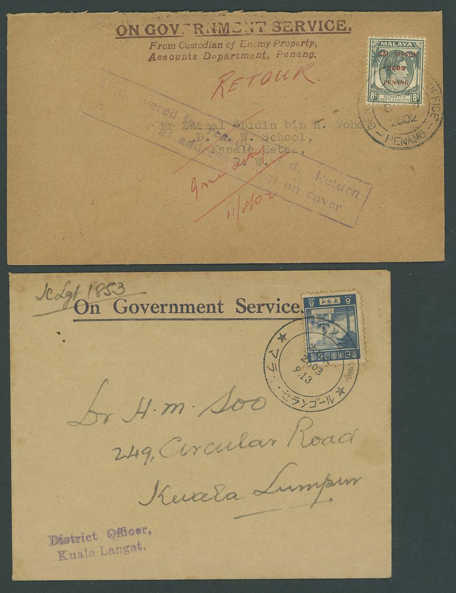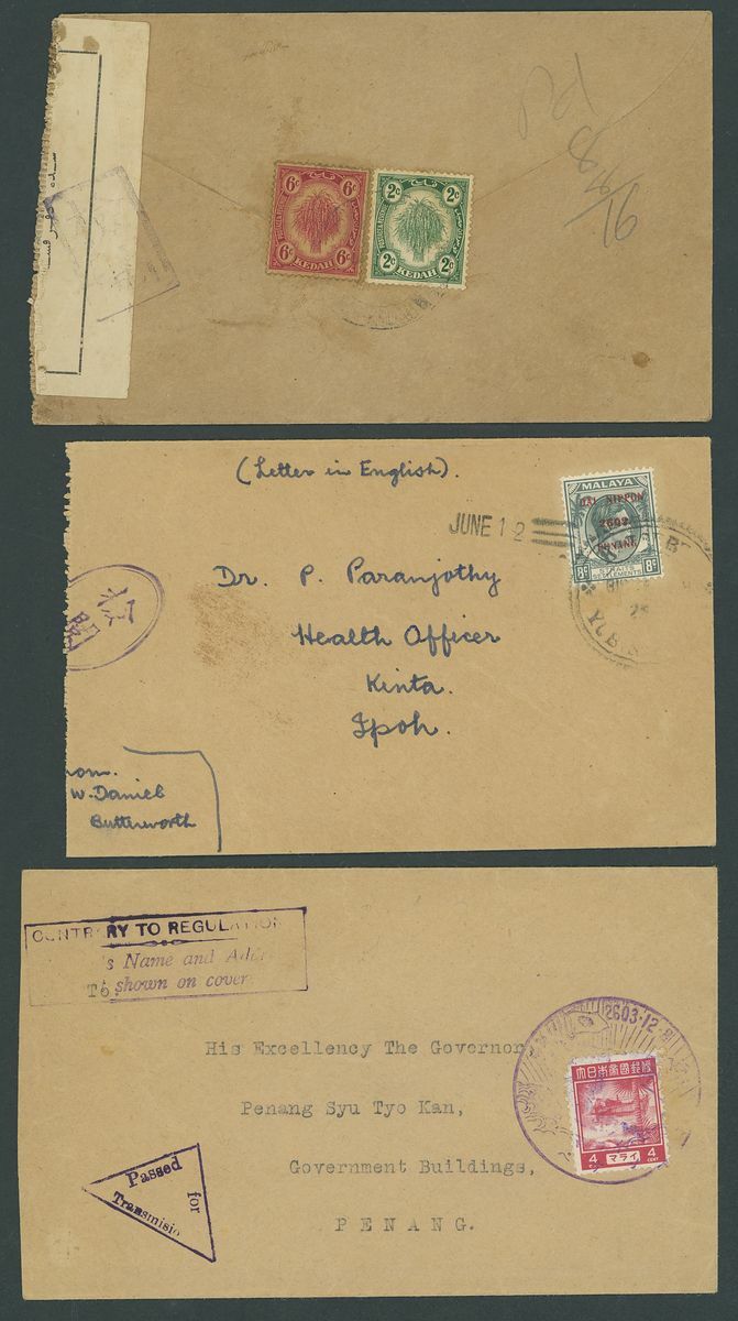 Postal history selection Kedah 1942 envelope to Parit Buntar bearing, on reverse, unoverprinted 2c. and 8c. tied by light Alor Star Type D2 c.d.s., showing part Censor label at left tied by violet chop; 1943 (Dec.) locally addressed envelope bearing Pictorial 4c. tied by violet 2nd Anniversary of Greater East Asia War commemorative h.s., showing triangular-framed