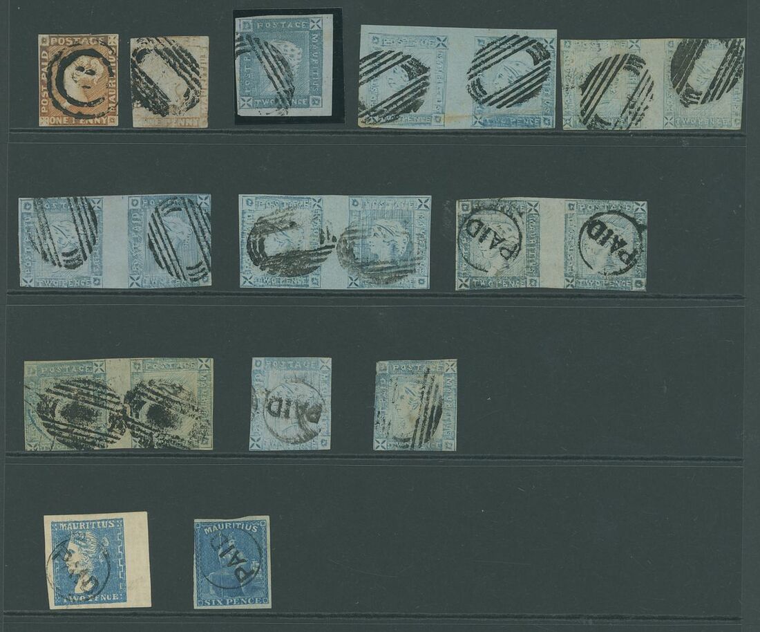 1848-61 used group on a Hagner page (19) comprising 1848-59 intermediate impression 1d. red-orange (S.G. 12, Sismondo Cert.), 1859 Lapirot with intermediate impression single example with large margins (Holcombe Opinion), later impression horizontal pairs (6) and further single examples, 1859-61 Britannia 6d. used and 1859 Dardenne 2d. used from the right of the sheet (Bolaffi and Diena Certificates); mixed condition with some faults as to be expected such as thinning and soiling, but a valuable lot. S.G. cat. value in excess of £17,000