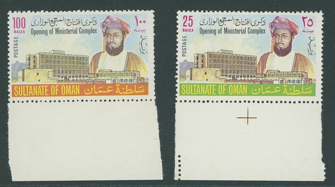 1973 Ministerial Complex 25b. and 100b., each with variety "date omitted", unmounted mint; tiny wrinkles, fine and rare. S.G. 170a-171a, £900