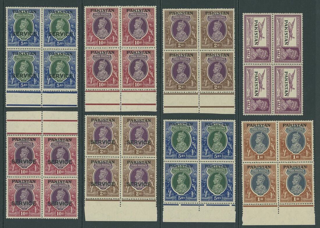 1947-54 selection (8) of mint blocks of four including 1947 14a. to 10r. and Officials 1948-54 2r. to 10r., each block with the upper pair mounted and lower pair unmounted. Fine.