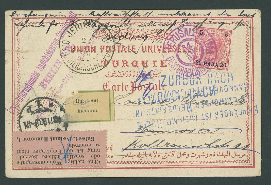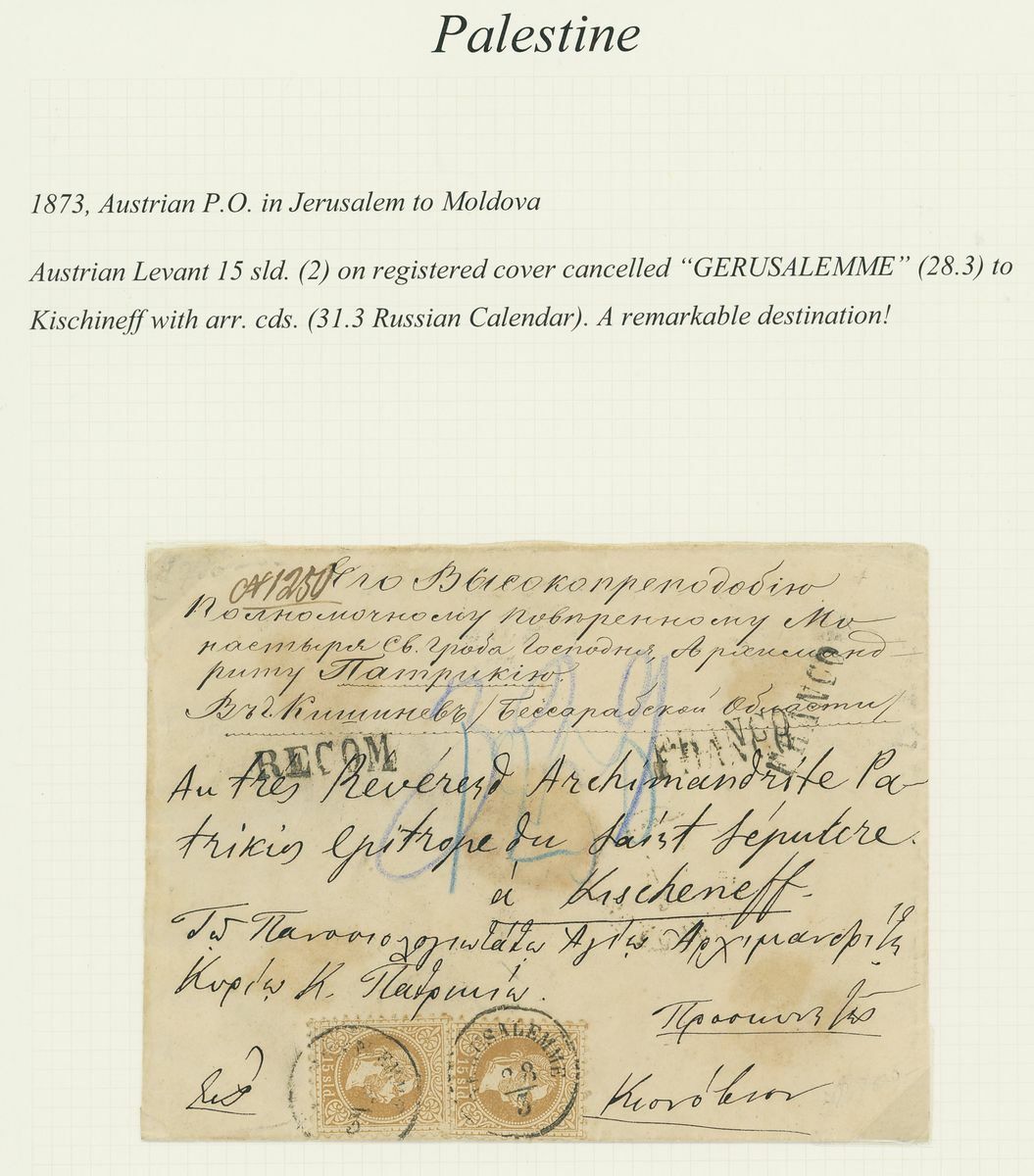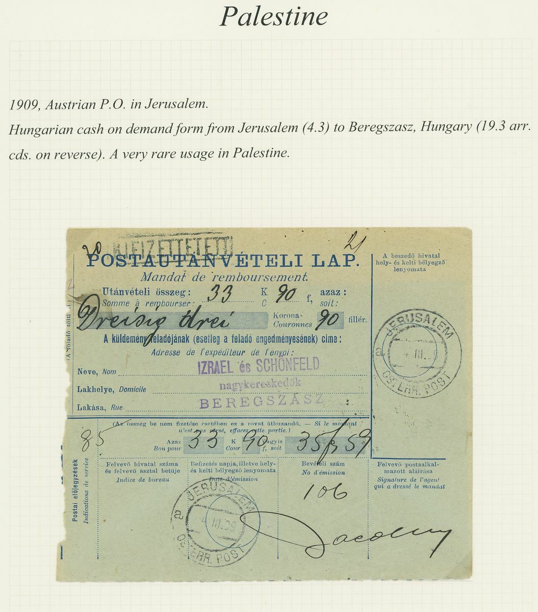 1873 (28 March), envelope Registered from Jerusalem to Moldova franked 15s. brown (2), Recom and Franco handstamps on the front, 1898m (31 Oct.), coloured p.p.c. (XXXI October) franked 20pa. on 5k., Inconnu label and Zuruck handstamp, 1909 (4 March) Hungarian cash on delivery form from Jerusalem to Beregszaszt; good to fine