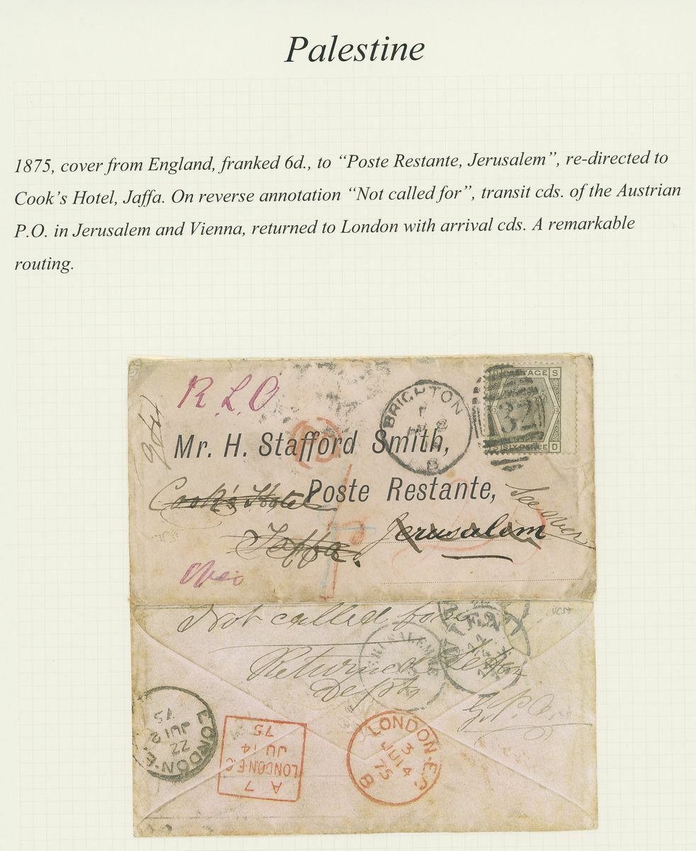 1875 (April), envelope from Brighton, addressed Poste Restante to Jerusalem, franked 6d. with "132" duplex cancellation, re-addressed to Cooks Hotel, Jaffa, on reverse manuscript Not called for, transit datestamps of the Astrian Post Offices in Jerusalem and Vienna, returned to London and with arrival d.s. (14.6); a trifle soiled but a remarkable routing