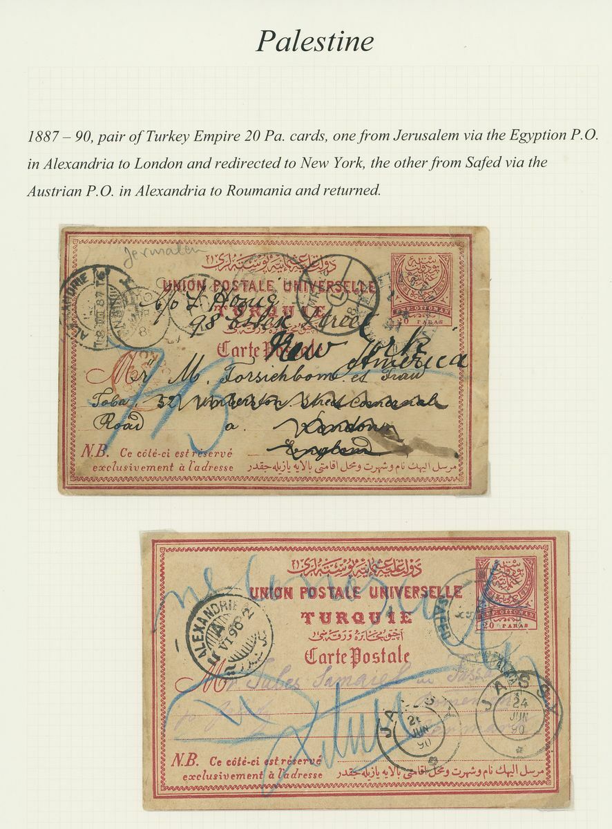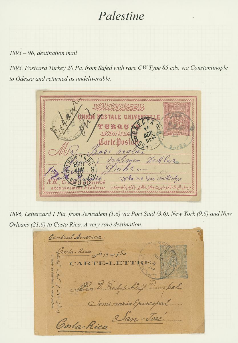 1887, Turkish 20pa. postal stationery card from Jerusalem to London, re-directed t0 New York, 1890, another 20pa. card from Safed to Romania and returned, 1893 20pa. card from Safed to Odessa (with rare Coles & Walker type 85 cancellation in blue), returned as undeliverable, 1906 1pi. letter card from Jerusalem to Costa Rica, 1914 1pi. envelope to London with blue Nasre (Coles & Walker 79) cancellation and with Caiffa alongside; good to fine
