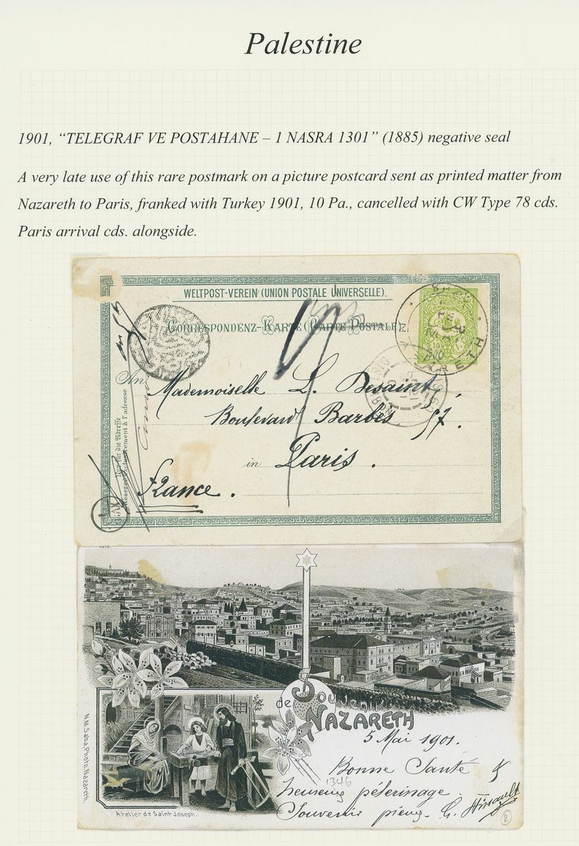 1901-15, selection of six items, including 1901 p.p.c. (Souvenir de Nazareth) franked 1pa. with Nazareth (Coles & Walker 78) cancellation and negative seal