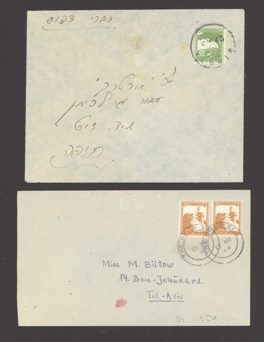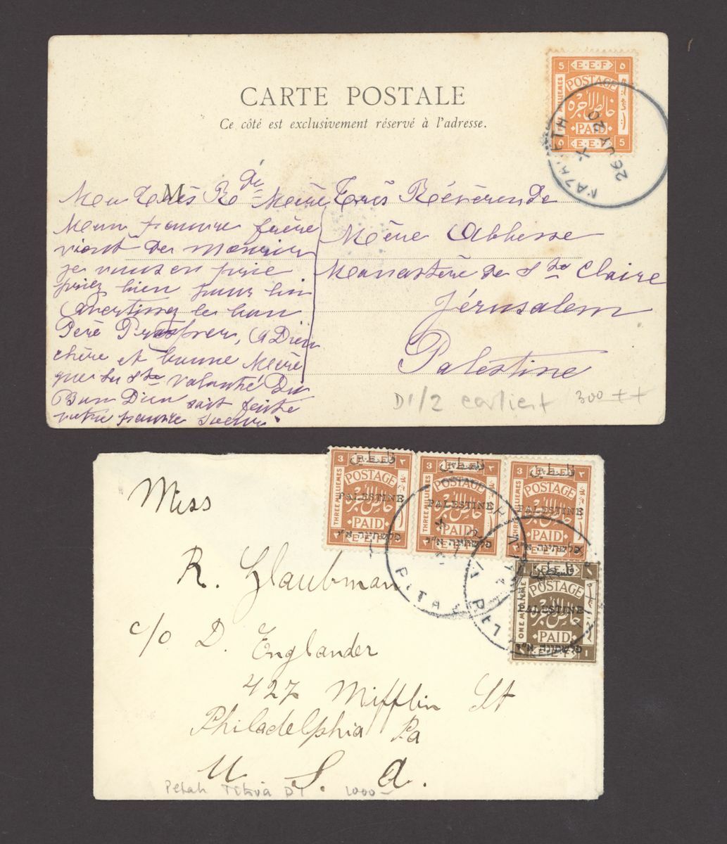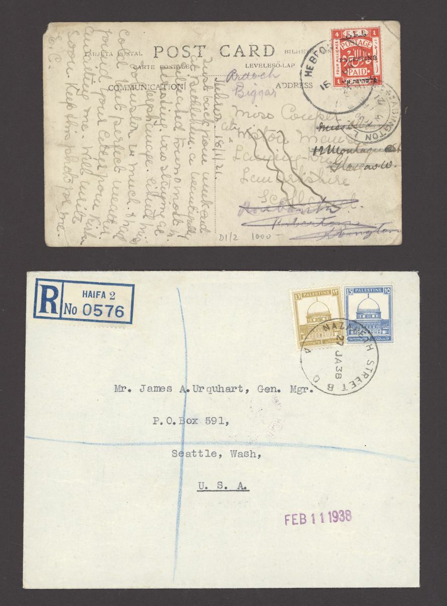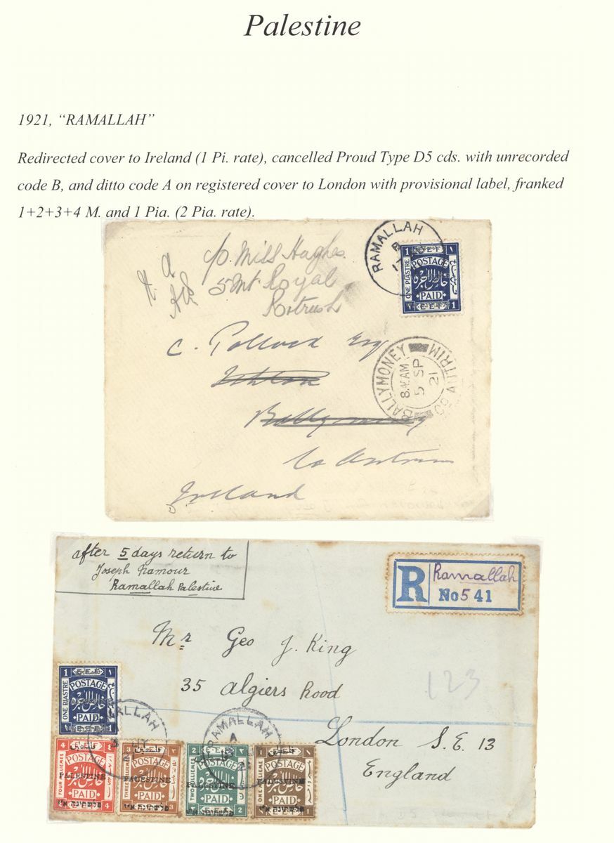 Alonim to Sarona, selection of twenty-two covers or cards, including Alonim 1945 cover franked 1927-45 3m., Dead Sea 1944 and 1945 (Registered) covers, Ein Karim 1947 Registered cover franked 1927-45 2m., 10m. and 13m. with provisional label, Givat Brenner 1939 and 1947 covers with Proud D3 or D5 cancellations, Haifa 1938 cover Registered to Srattle franked 1927-45 13m., 15m. with Nazareth Street B.O (Proud B1) cancellation, Hebron 1921 p.p.c. (Market of Bethlehem) franked 1920 4m. with Hebron (Proud D1, state 2) cancellation, Maoz Hain 1944 and 1947 covers with Proud D1 or D3 cancellations, Petah Tikva 1921 envelope to the United States franked 1920-21 1m. nd 3m. (3) with Petach Tikvah (Proud D1) cancellation, Ramatain 1936 4m. postal stationery card to Haifa with Proud D1 cancellation, Sarona, etc., chiefly good to fine. A valuable and interesting selection