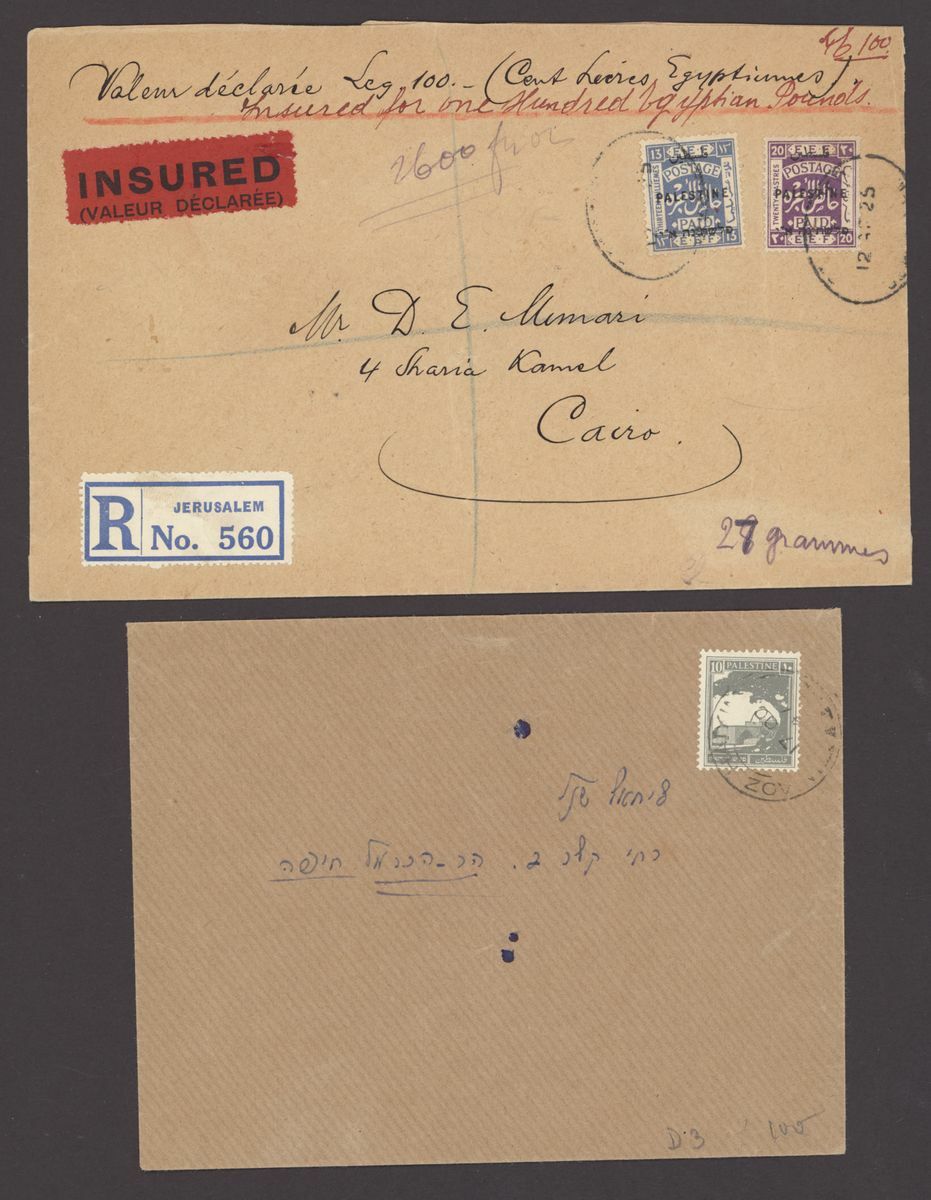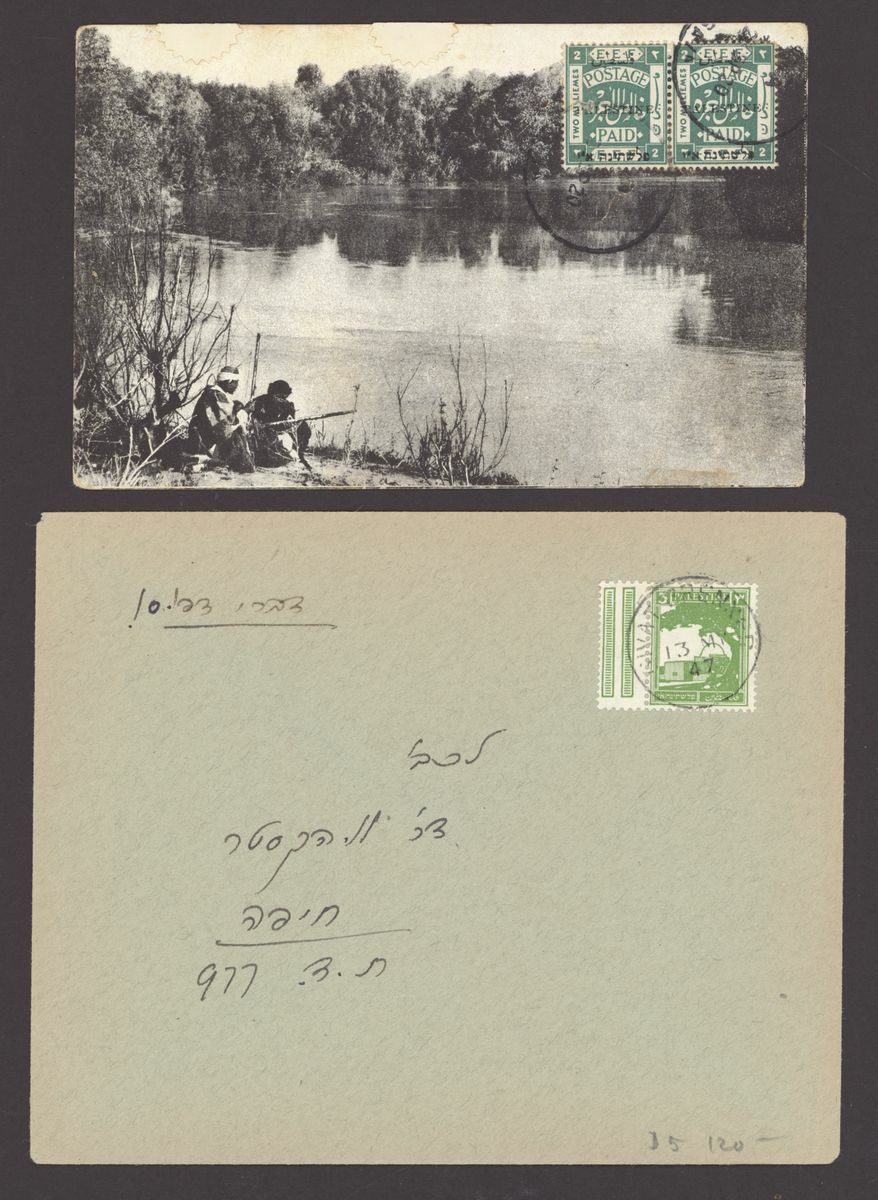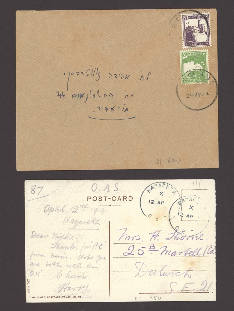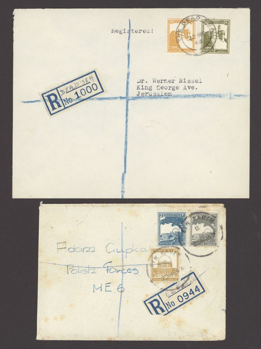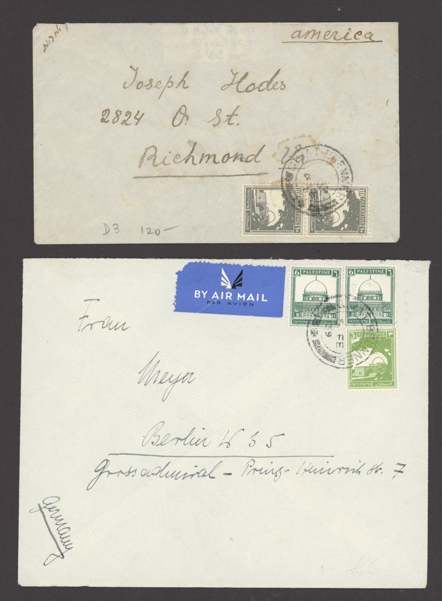 Alonim to Sarona, selection of twenty-two covers or cards, including Alonim 1945 cover franked 1927-45 3m., Dead Sea 1944 and 1945 (Registered) covers, Ein Karim 1947 Registered cover franked 1927-45 2m., 10m. and 13m. with provisional label, Givat Brenner 1939 and 1947 covers with Proud D3 or D5 cancellations, Haifa 1938 cover Registered to Srattle franked 1927-45 13m., 15m. with Nazareth Street B.O (Proud B1) cancellation, Hebron 1921 p.p.c. (Market of Bethlehem) franked 1920 4m. with Hebron (Proud D1, state 2) cancellation, Maoz Hain 1944 and 1947 covers with Proud D1 or D3 cancellations, Petah Tikva 1921 envelope to the United States franked 1920-21 1m. nd 3m. (3) with Petach Tikvah (Proud D1) cancellation, Ramatain 1936 4m. postal stationery card to Haifa with Proud D1 cancellation, Sarona, etc., chiefly good to fine. A valuable and interesting selection
