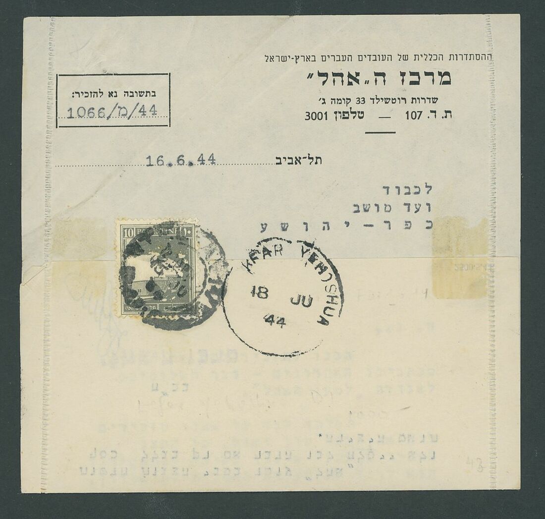 Kefar Yehoshua: 1944 (18 June), wrapper from Tel Aviv franked 1927-45 10m. (necessarily torn on opening) with a fine strike of the