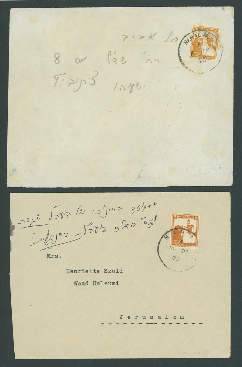 Nahalal: 1938 (14 Dec.), slightly truncated envelope to Jerusalem franked 1927-45 5m. tied by