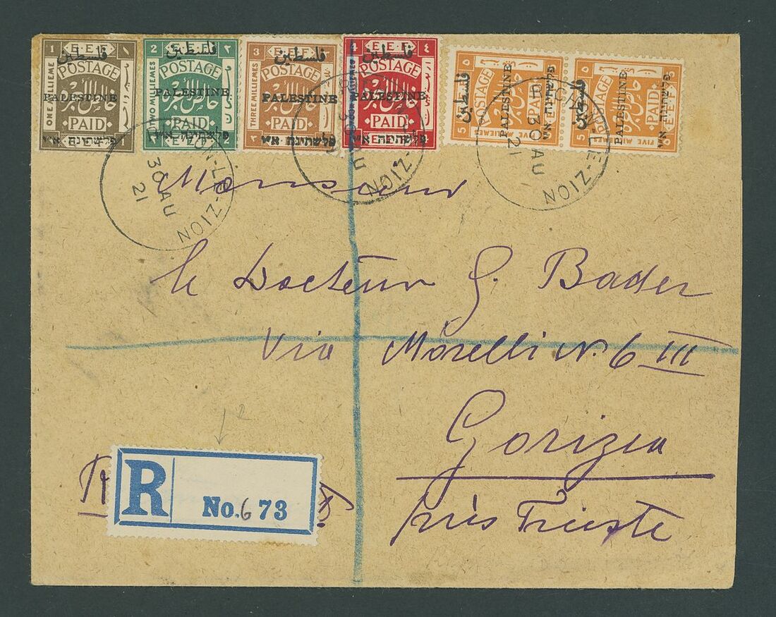 Richon-Le-Zion: 1921 (30 Aug.), envelope Registered to Goriza franked 1920 1m., 2m., 3m., 4m. and 5m. (pair) to make to the 20m. rate and sharing three "
