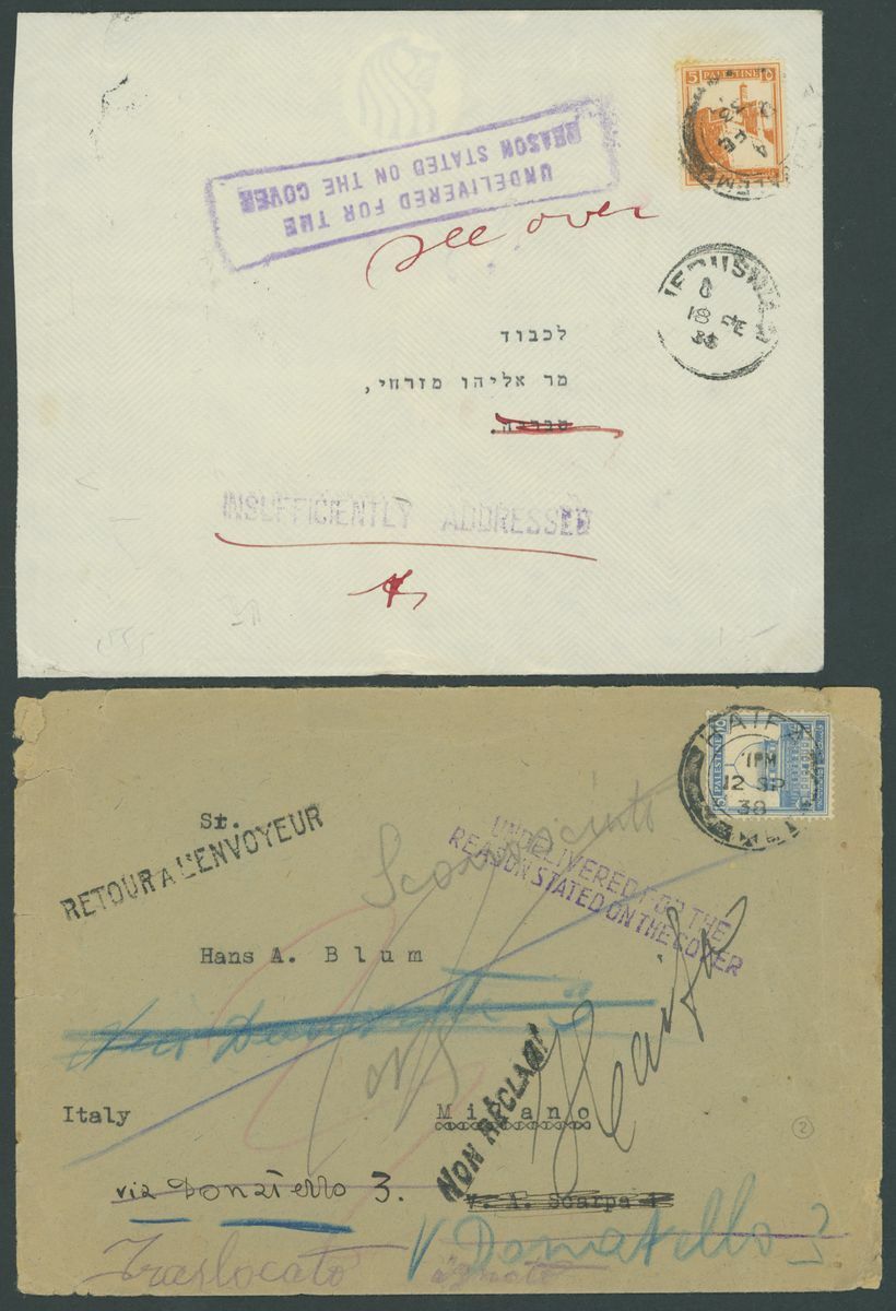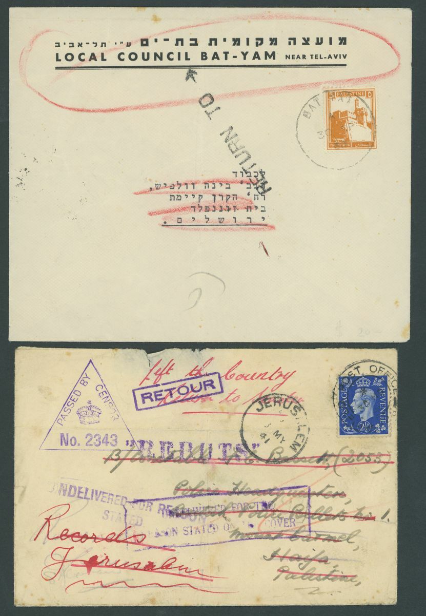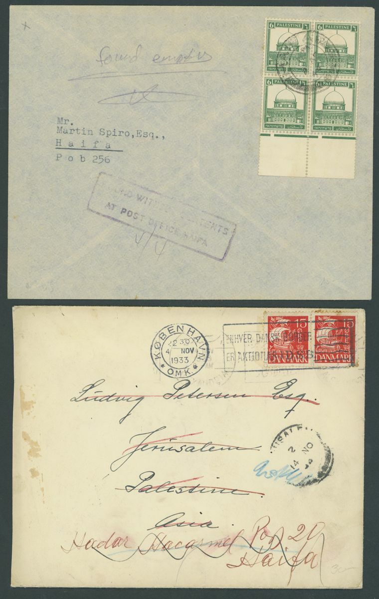 Returned Mail: 1933-41, group of seven covers or cards, including 1933 cover from Copenhagen to Jerusalem with violet "