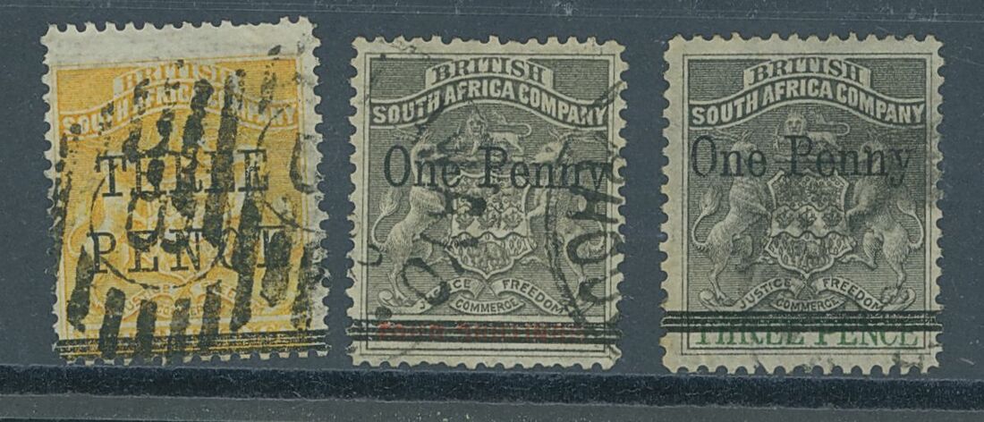 1896 Matabele Rebellion 1d. on 3d., 1d. on 4s. and 3d. on 5s., used, a few slightly short perfs., otherwise fine and scarce. S.G. 51-53, £1,525. Photo