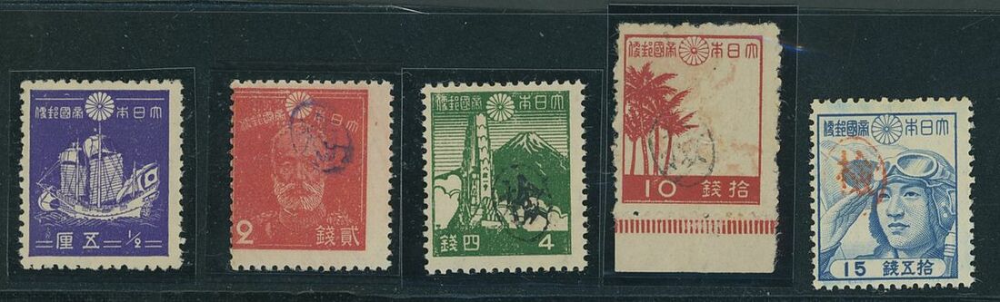 1947-48 unused selection (5) all with certificate including ½s., 2s., 4s. 10s. and 15s. slightly mixed condition with stamps without gum ½s., 2s. and 10s. as often encountered on these Provisional issues. A great lot for the specialist. Scott 2X1, 2X4, 2X9, 2X15, 2X18, $3,500