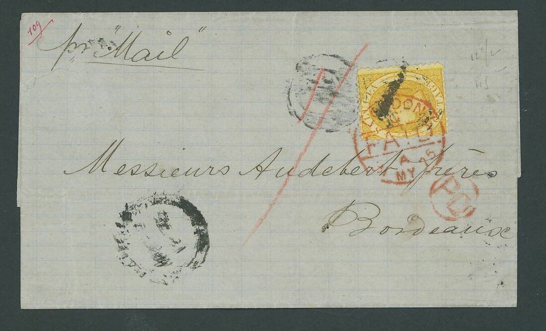 1875 (May) entire to Bordeaux, via London, bearing 1864-76 4d. yellow tied by 'A11',