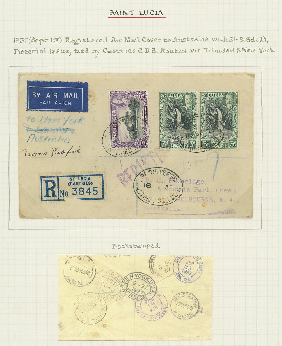 1937 (18 Sept.) envelope (slightly soiled) registered from Castries to Australia, marked "to New York/to London/Australia" in blue crayon and "Trans Pacfic", bearing 1932 3d. pair and 5/- tied by