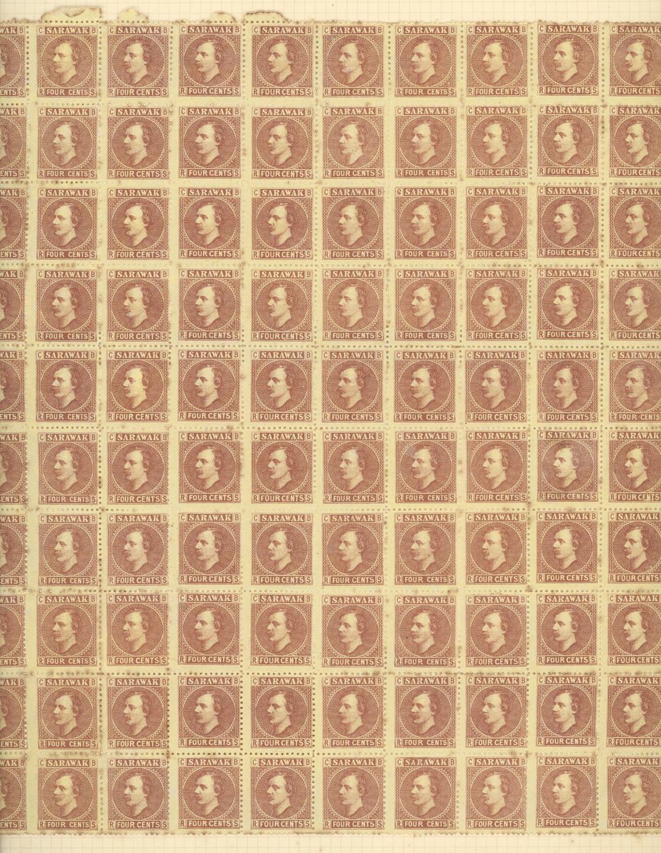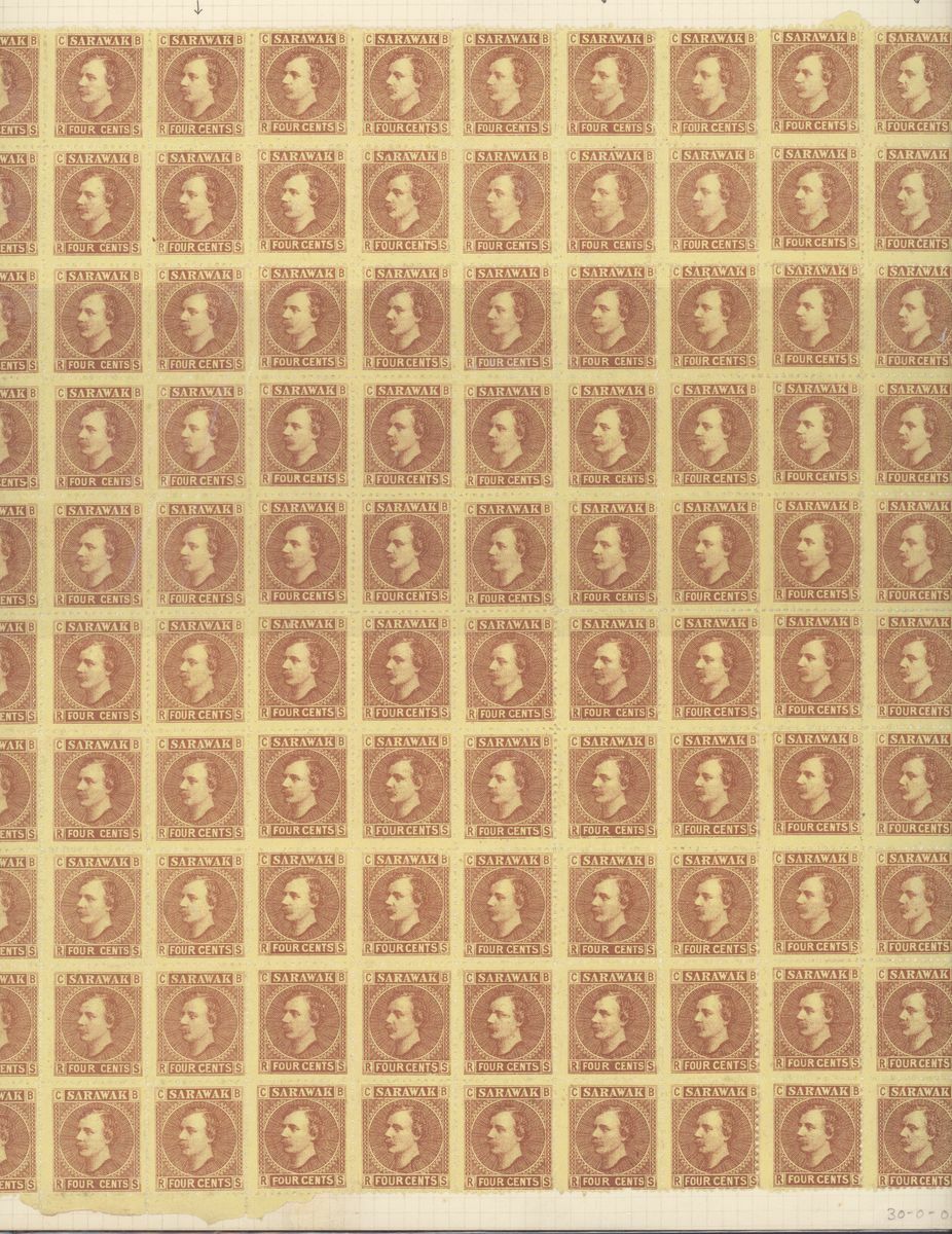4c. red-brown on yellow, Pane B, a complete pane of 100 with part margins, unused without gum, some split and re-inforced perforations and foxing in places. S.G. 4