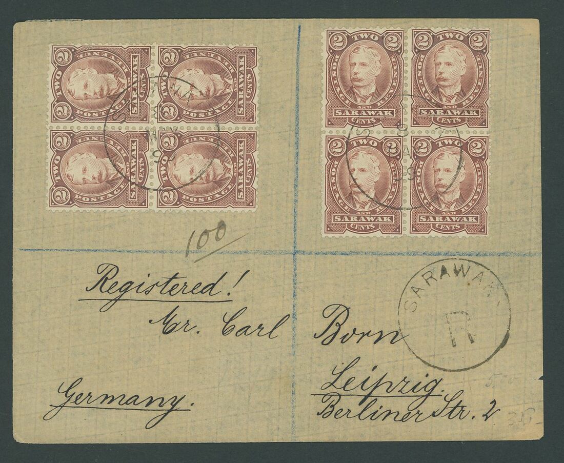 1899 (8 May) envelope registered to Germany, bearing 1895 2c. blocks of four (2), both centrally cancelled by Sarawak c.d.s. (Type D4) and showing Type R3 registration handstamp with Brindisi transit c.d.s. on reverse. Photo