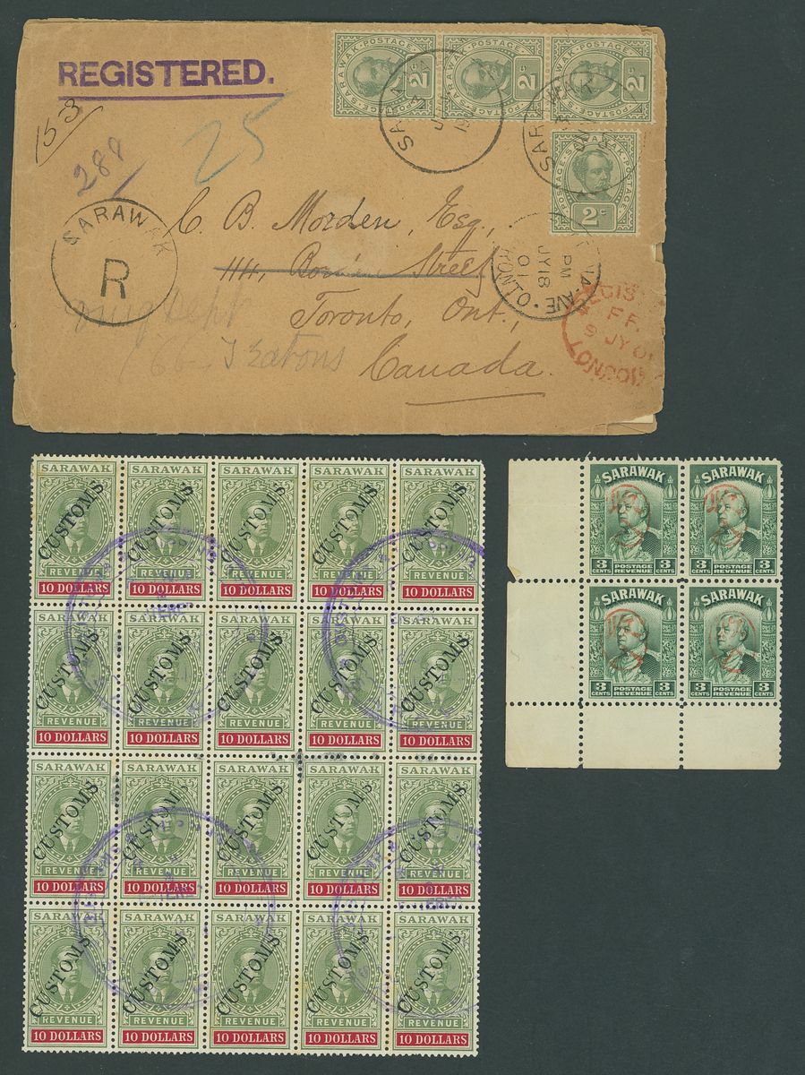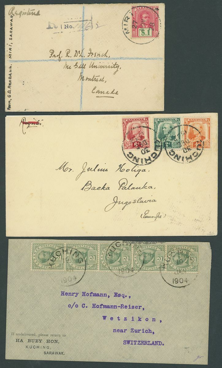 1901-24 group of covers (7) including 1904 printed 'Ha Buey Hon, Sarawak' envelope to Switzerland bearing 1899 2c. strip of five, 1901 envelope Registered to Canada bearing 1899 2c. (4) and on reverse 1c. strip of four, four 1928 envelopes sent Registered ex the same correspondence to Canada bearing 1918 issues with various colourful frankings, 1933 envelope to Yugoslavia bearing 1932 2c., 4c, and 6c.; also some Revenue stamps including Customs $10 block of sixteen used and Japanese Occupation blocks of 2c. and 3c. mint; a useful group