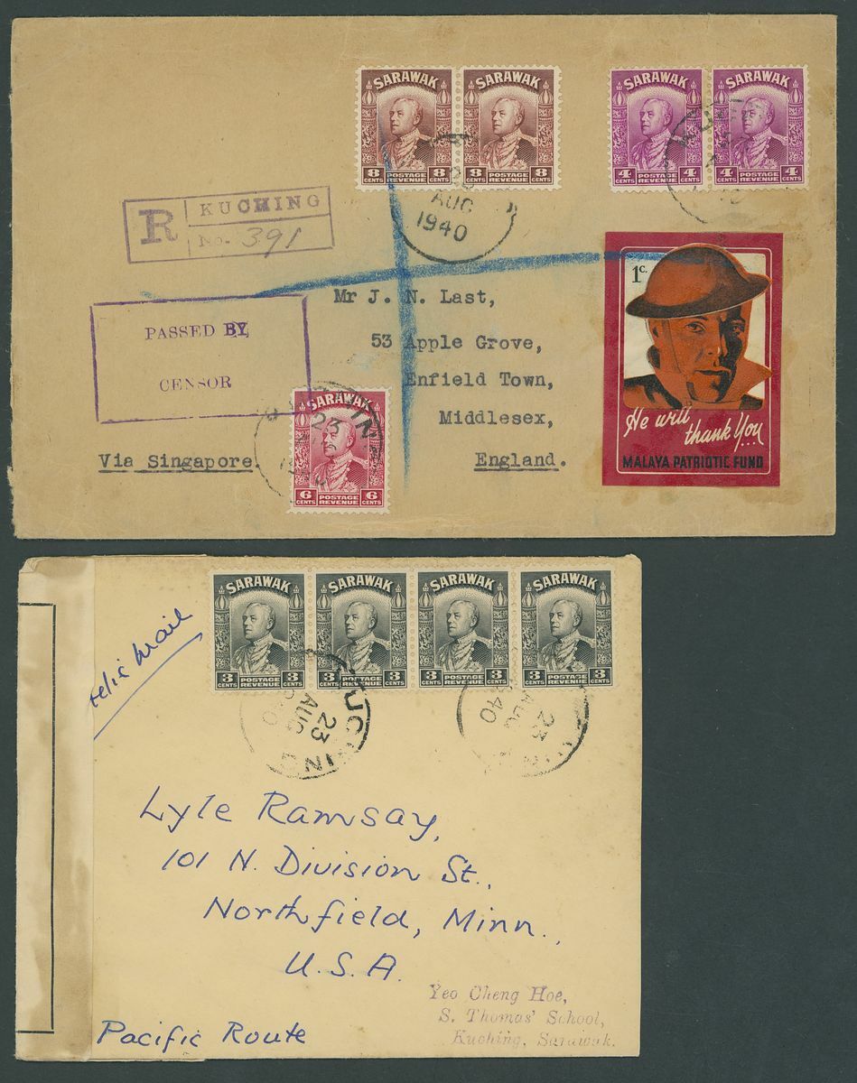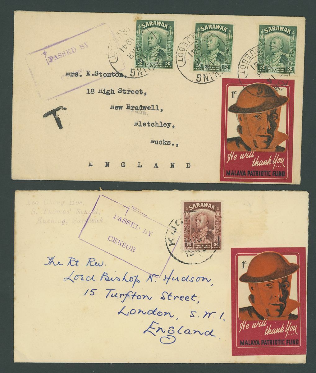 1940-41 a selection (4) of censored envelopes (one registered), showing Malaya Patriotic Fund 1c. label, including three envelopes with the label affixed on the front (one tied by c.d.s.) and one on the reverse. A fascinating group for the student of the area.