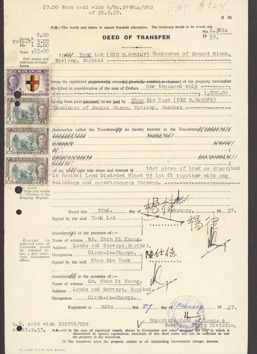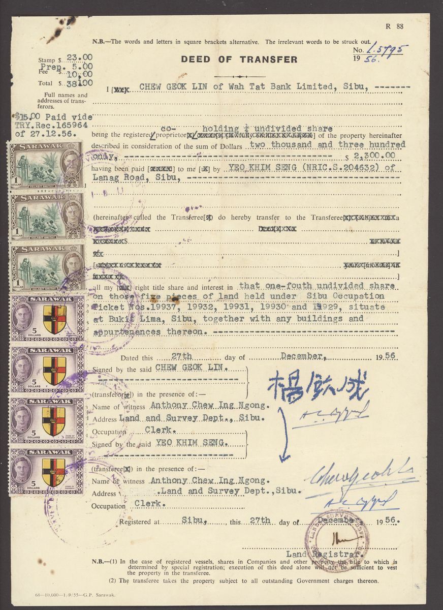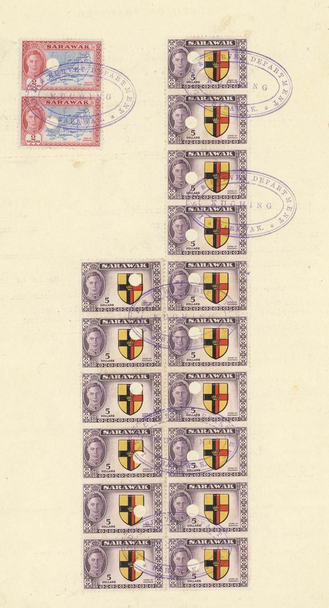 1953 (1 Oct.), 1956 (27 Dec.) and 1957 (22 Feb.) Deed of Transfers; the first bearing 1950 $2 vertical pair and $5 irregular block of sixteen, each with a large punch hole and all tied oval