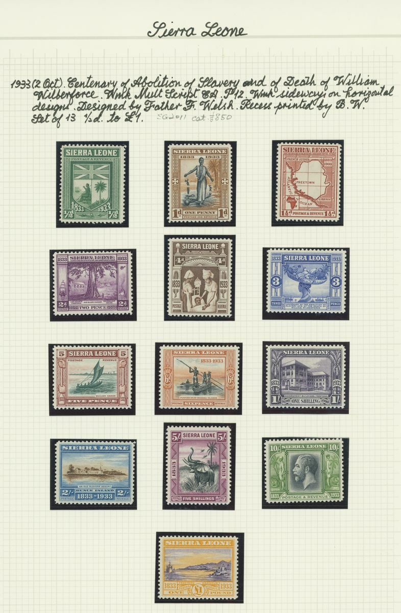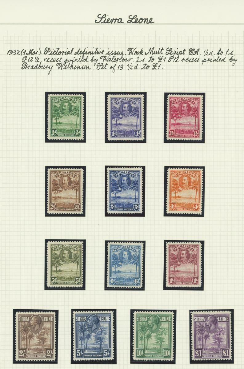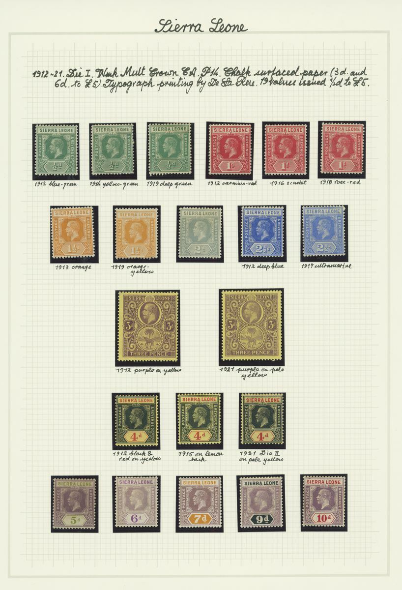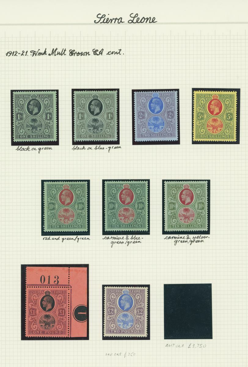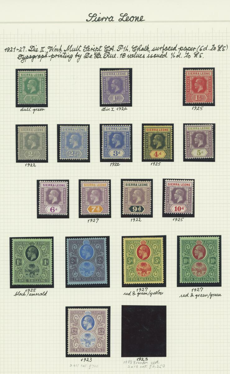 1912-33 mint group on album pages including 1912-21 MCA set to £2 and with some shades including 10/- (3) and the £1 value a plate number '1' example from the upper right of the sheet with current number '013', 1921-27 Script set to £2, 1932 set to £1 and 1933 Wilberforce set to £1; fine and fresh mint. S.G. cat. value in excess of £4,200