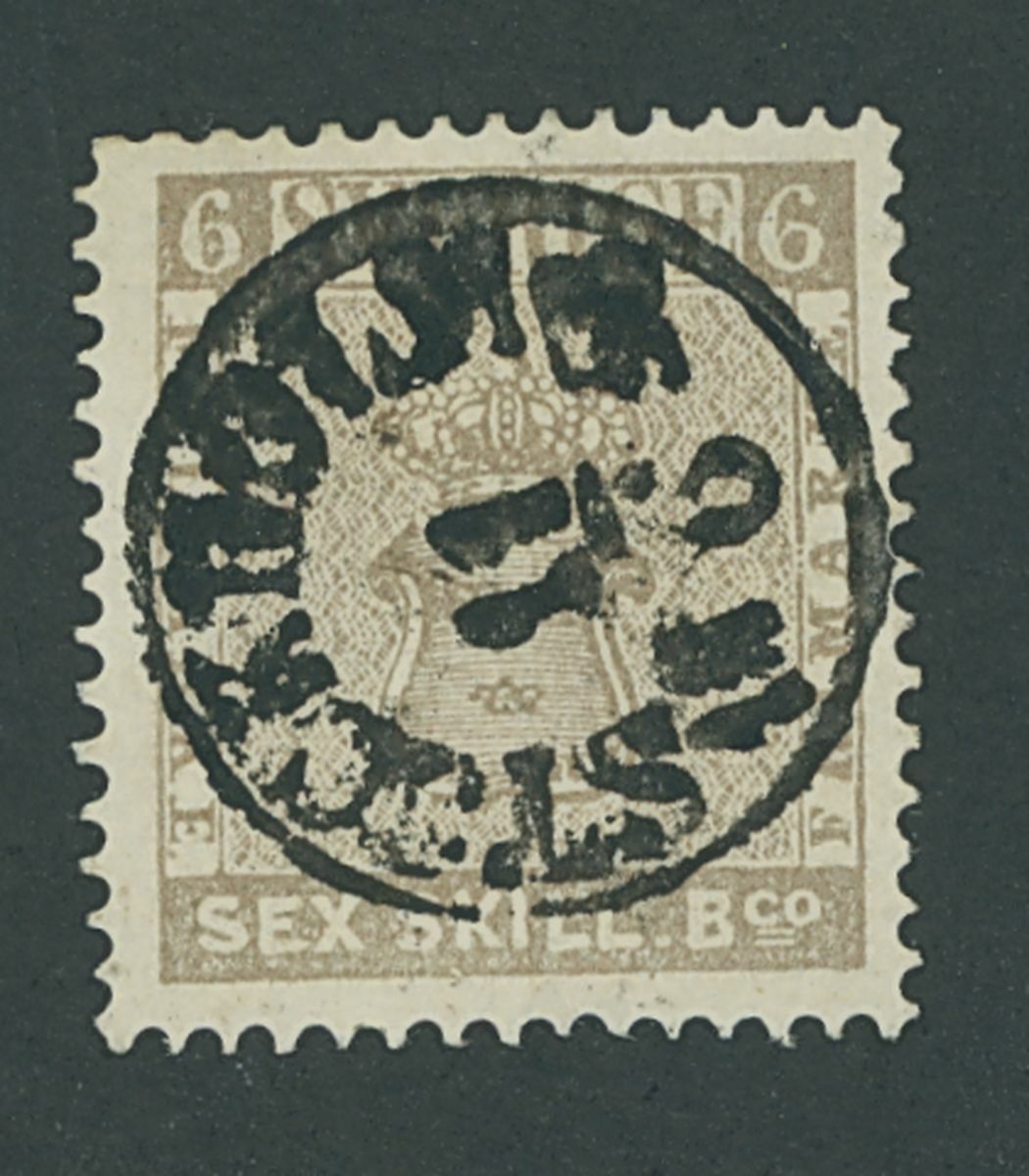 1855-58 6s. brownish-grey, complete Stockholm c.d.s. of 11 June 1858, fine and an attractive example of this rare stamp. B.P.A. Certificate (2001). S.G. 3b. Photo