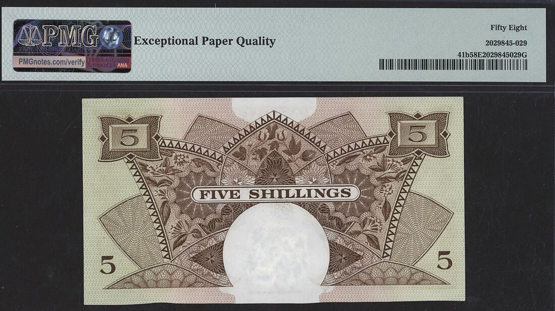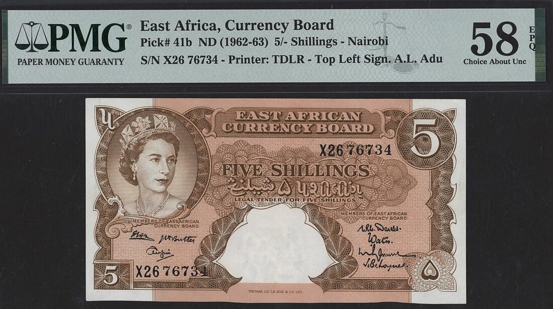 (x) East African Currency Board, 5 Shillings, Nairobi, ND (1962-63), serial number X26 76734, (Pick 41b), in PMG holder 58 EPQ Choice About Uncirculated