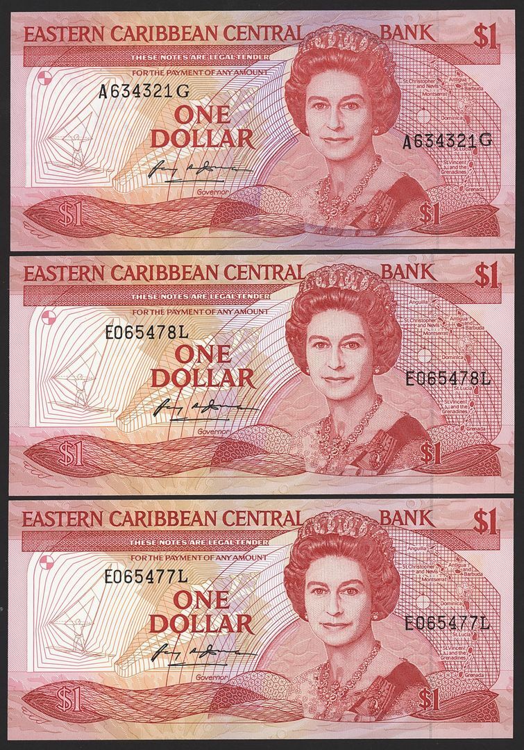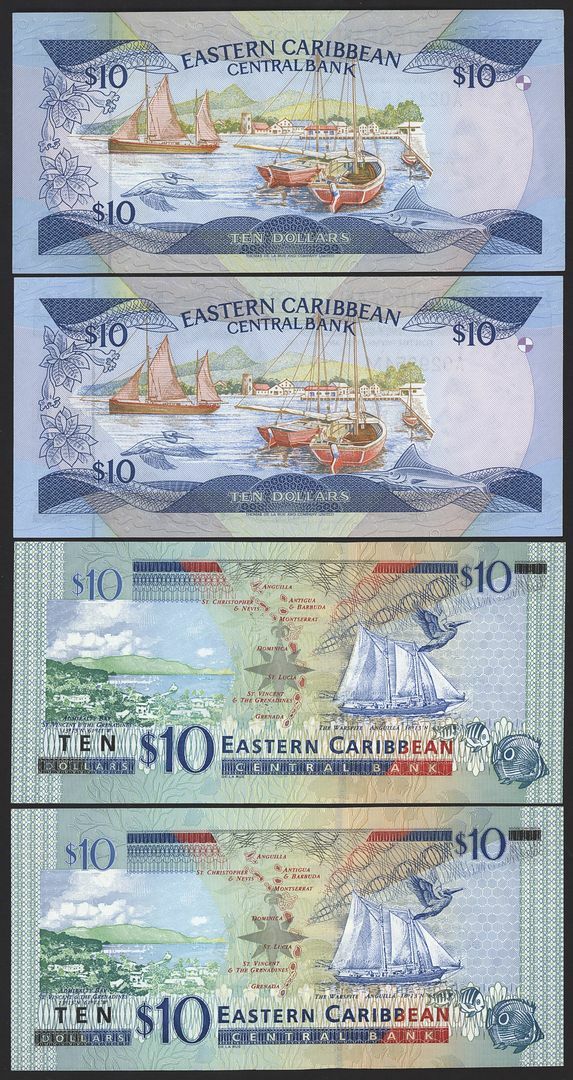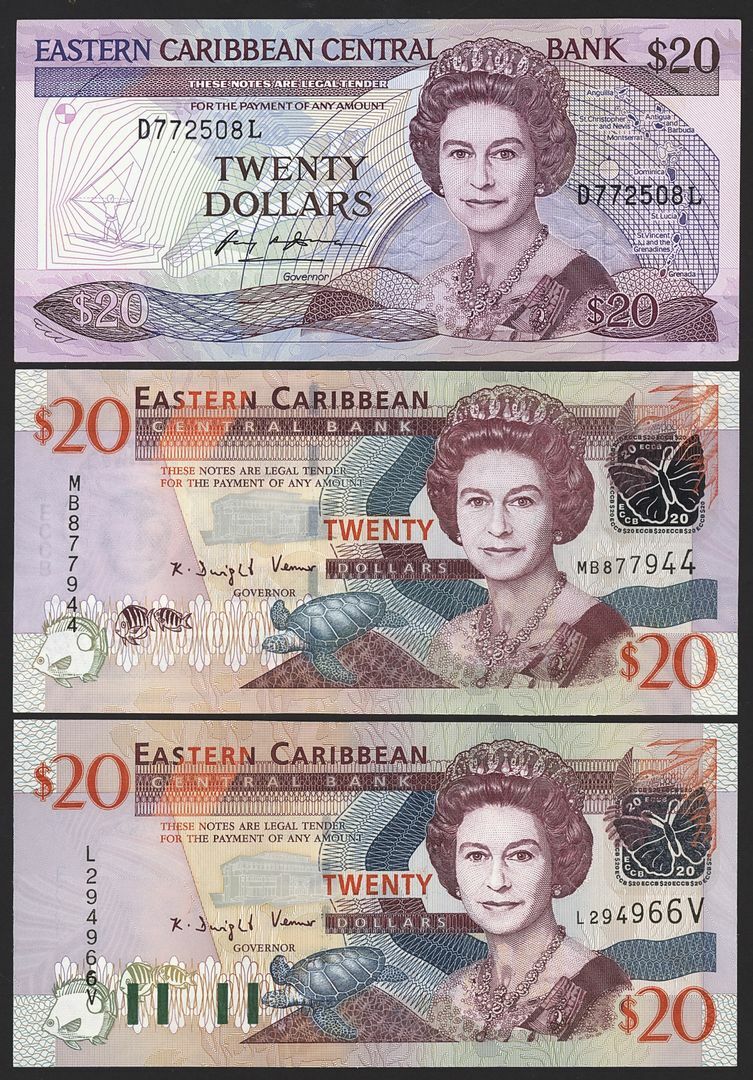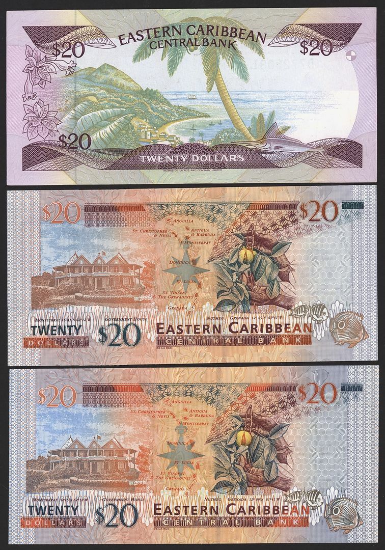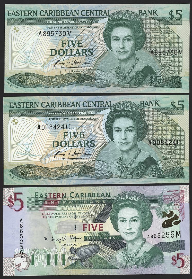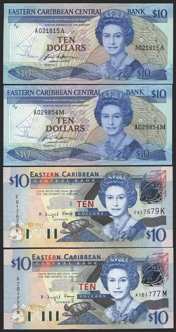(x) East Caribbean Central Bank, [18 notes] 1, 5, 10, 20, 50, 100 Dollars, 1985-2001, (Pick 17, 18, 21, 22, 23, 24, 29, 37, 38, 39, 40, 41), about uncirculated to uncirculated (18 notes)