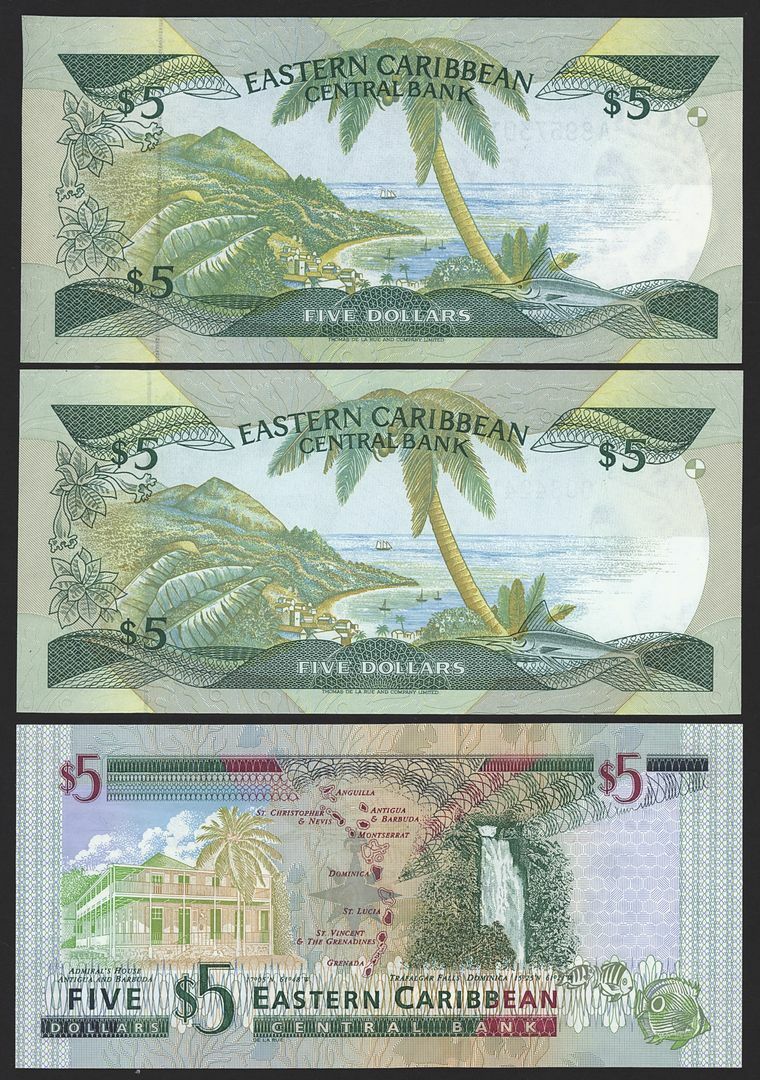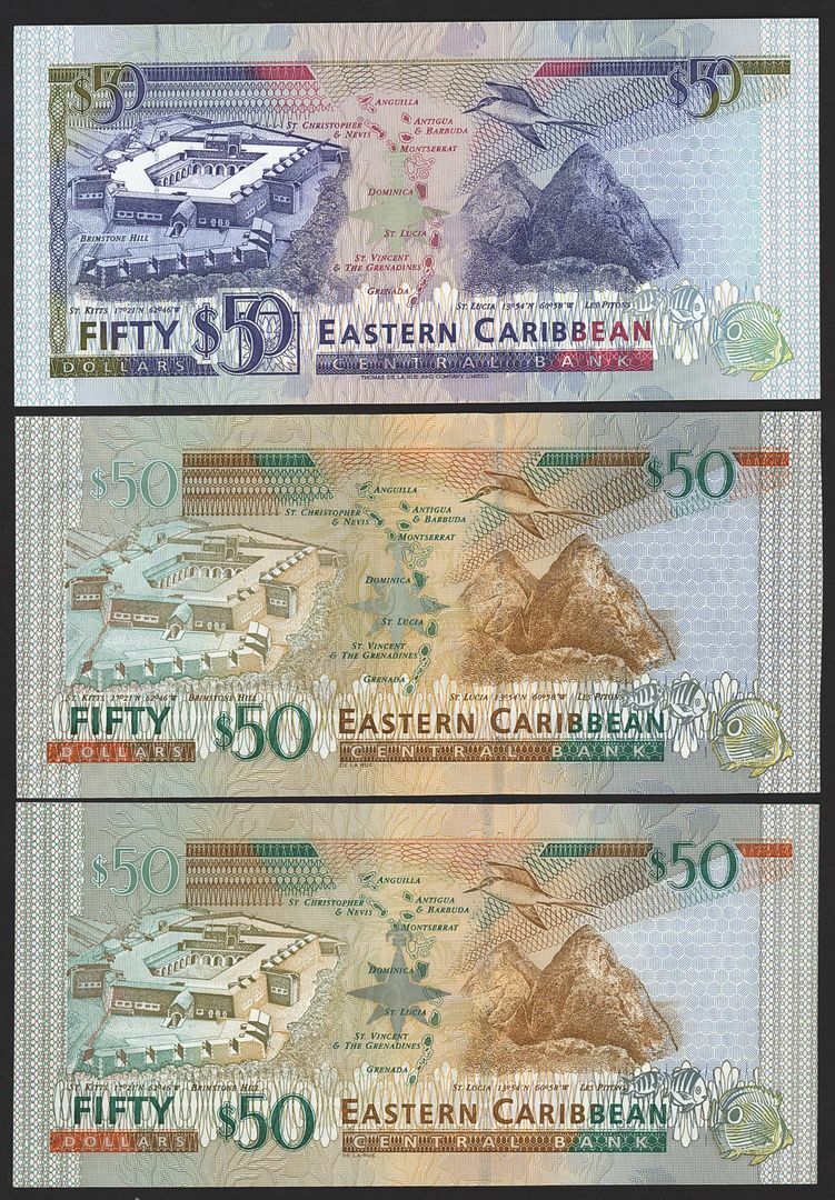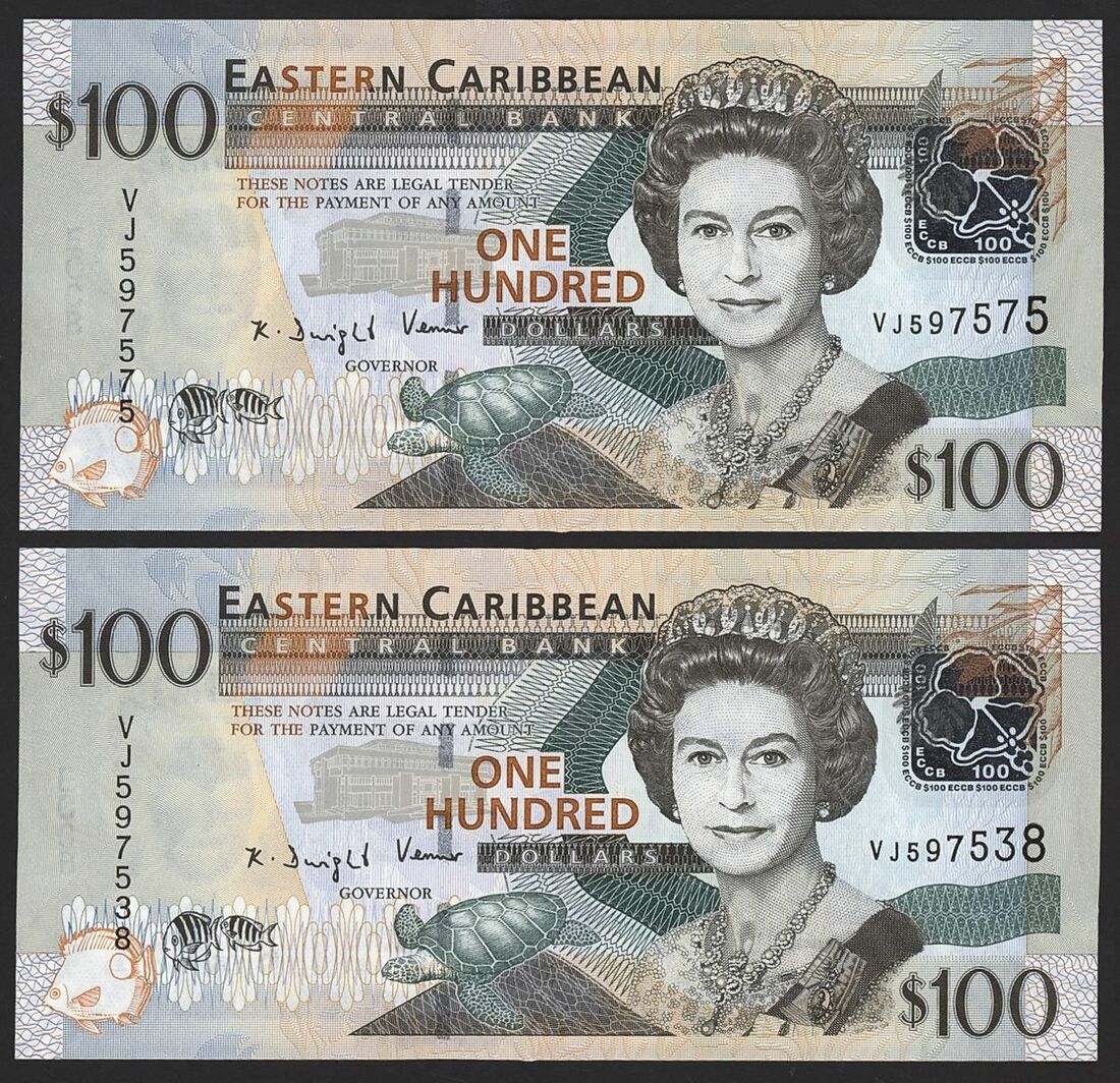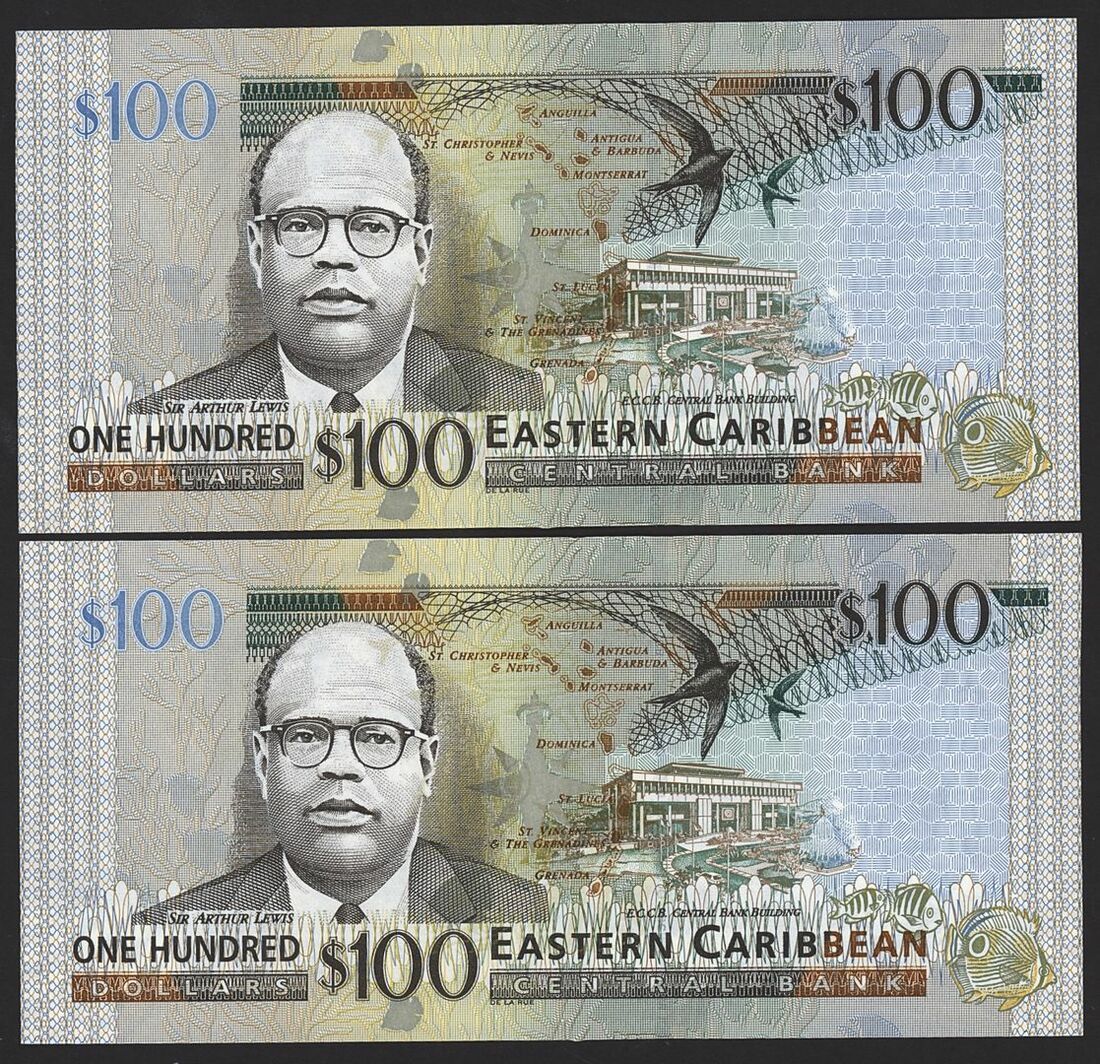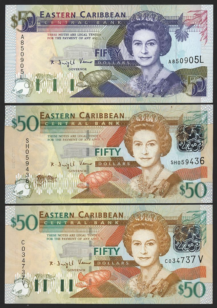 (x) East Caribbean Central Bank, [18 notes] 1, 5, 10, 20, 50, 100 Dollars, 1985-2001, (Pick 17, 18, 21, 22, 23, 24, 29, 37, 38, 39, 40, 41), about uncirculated to uncirculated (18 notes)