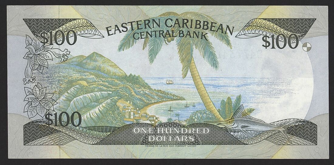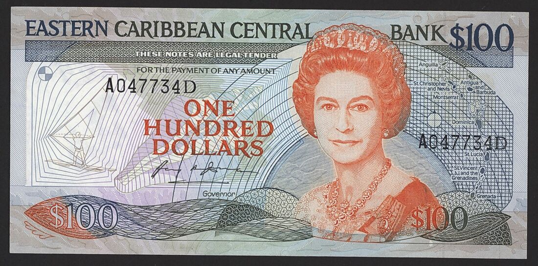 (x) East Caribbean Central Bank, 100 Dollars, ND (1988-1993), serial number A047734D, (Pick 25d1), About Uncirculated