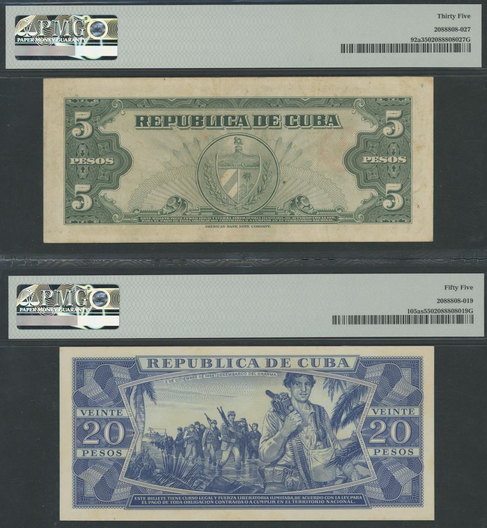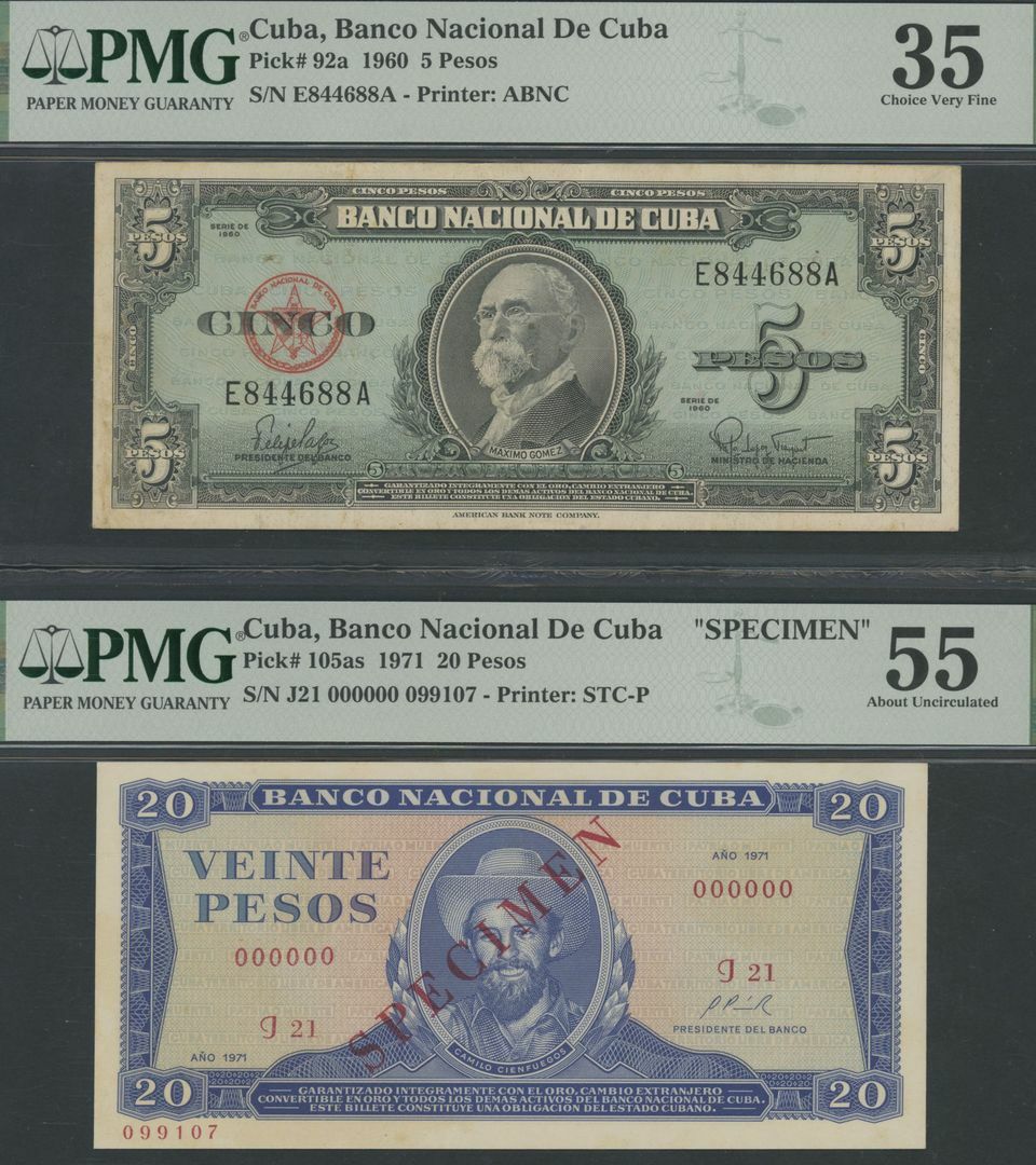 Cuba (3), 20 Pesos, 1958, serial number H318370A, 5 Pesos, 1960, serial number E844688A, 20 Pesos specimen, 1971, serial number J21 000000 099107;