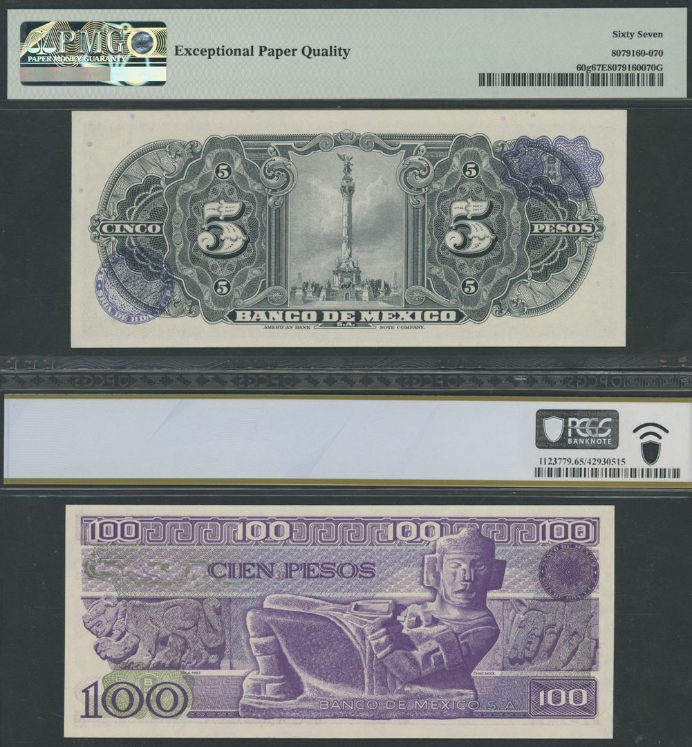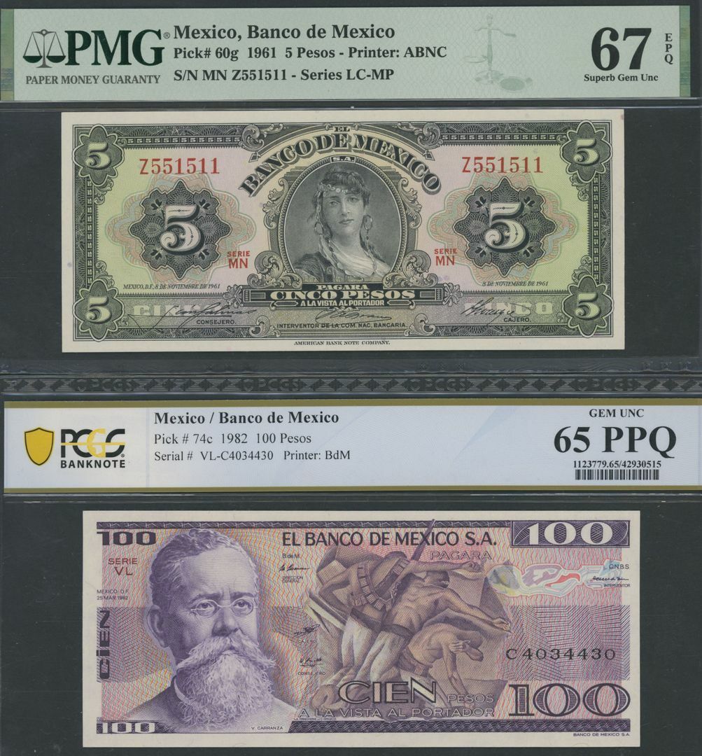 Mexico (3), 5 Pesos, 1961, serial number Z551511, 100 Pesos, 1982, serial number C4034430, 20 Pesos, 1915, serial number 462303;
