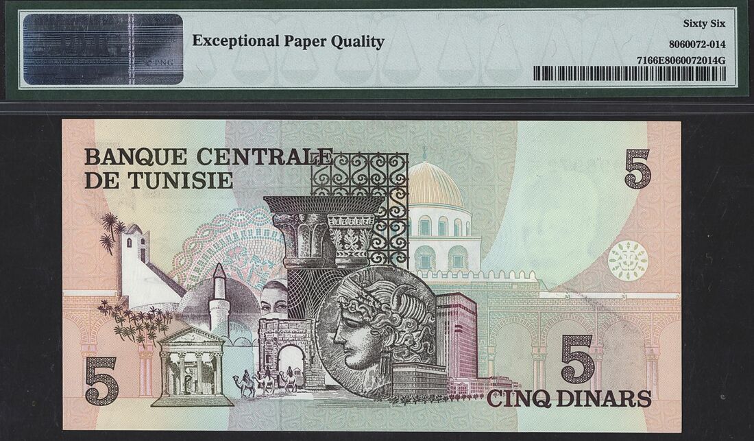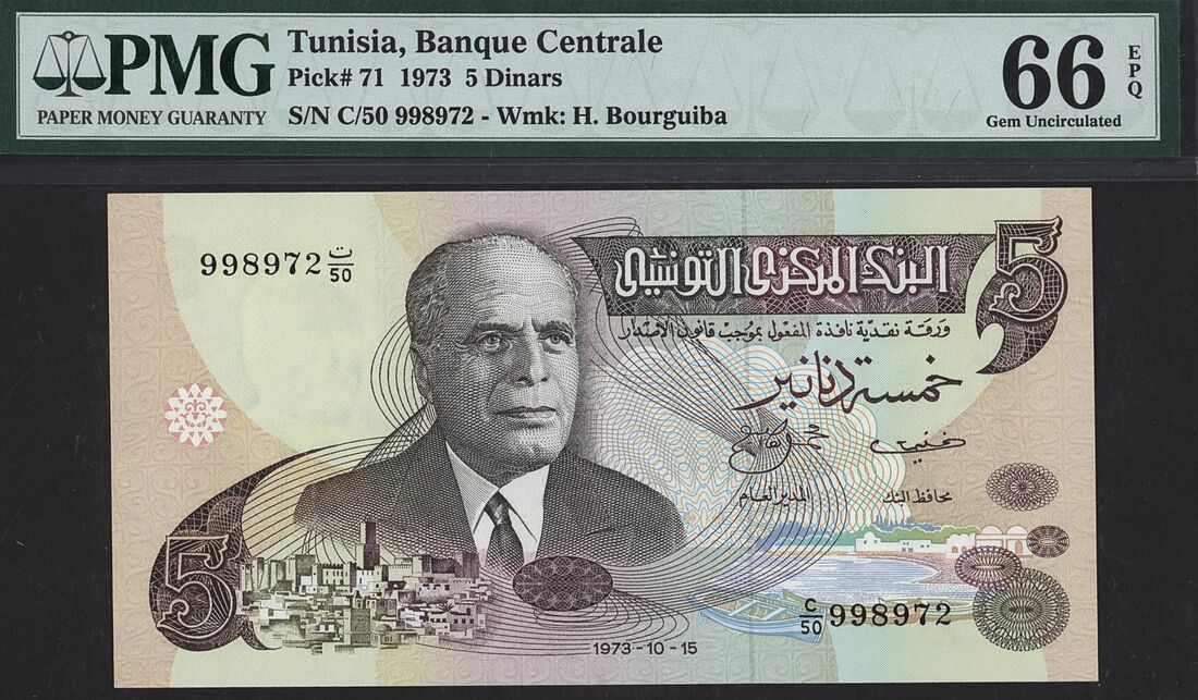 Tunisia, Central Bank (1): 5 Dinars, 15th October 1973, serial number C/50 998972;