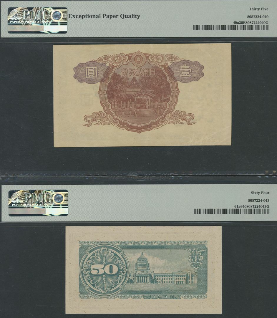 Japan (3) 1 Yen, ND (1943), serial number 345766, 50 Sen, ND (1948), serial number 219344, 100 Yen, ND (1946), serial number 344754;