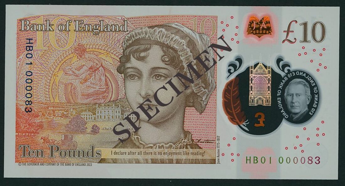 Bank of England, Sarah John, polymer £10, 5 June 2024, serial number HB01 000083, orange-brown, King Charles III at right and in a transparent window at left with text £10 BANK OF ENGLAND. Winchester Cathedral in gold also appears over the window. To the right of Winchester Cathedral is a quill, which shows as orange or purple depending on the angle of view. Reverse, orange-brown, a portrait of Jane Austen. To her left is an illustration of Elizabeth Bennet, the central character in 'Pride and Prejudice'.