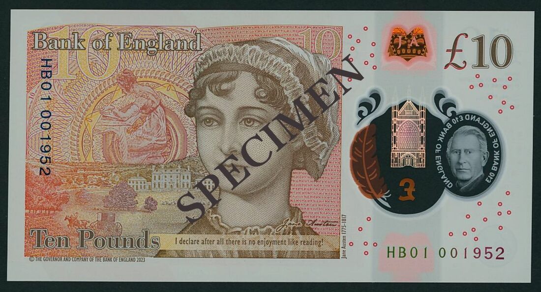 Bank of England, Sarah John, polymer £10, 5 June 2024, serial number HB01 001952, orange-brown, King Charles III at right and in a transparent window at left with text £10 BANK OF ENGLAND. Winchester Cathedral in gold also appears over the window. To the right of Winchester Cathedral is a quill, which shows as orange or purple depending on the angle of view. Reverse, orange-brown, a portrait of Jane Austen. To her left is an illustration of Elizabeth Bennet, the central character in 'Pride and Prejudice'.