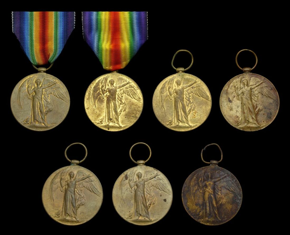 Victory Medal 1914-19 (7) (254 Sepoy Muzaffar Khan, 24 Pjbis.; 557 Spr Mohd Khan, I.S.C.; 317 L-Dfdr. Alyas Khan, 11 Lcrs.; 6598 W-Carrier Thumboosawmy. A.H.C.; 3935 1/2 Sepoy Gheba Khan, 52 Sikhs F.F.; 27 Spr. Dr. Shah Wewaz, I. Sig. Cps.; 181 Sepoy Ali Gohar, 124 Bal. Infy.), some minor official corrections, otherwise good fine to very fine
